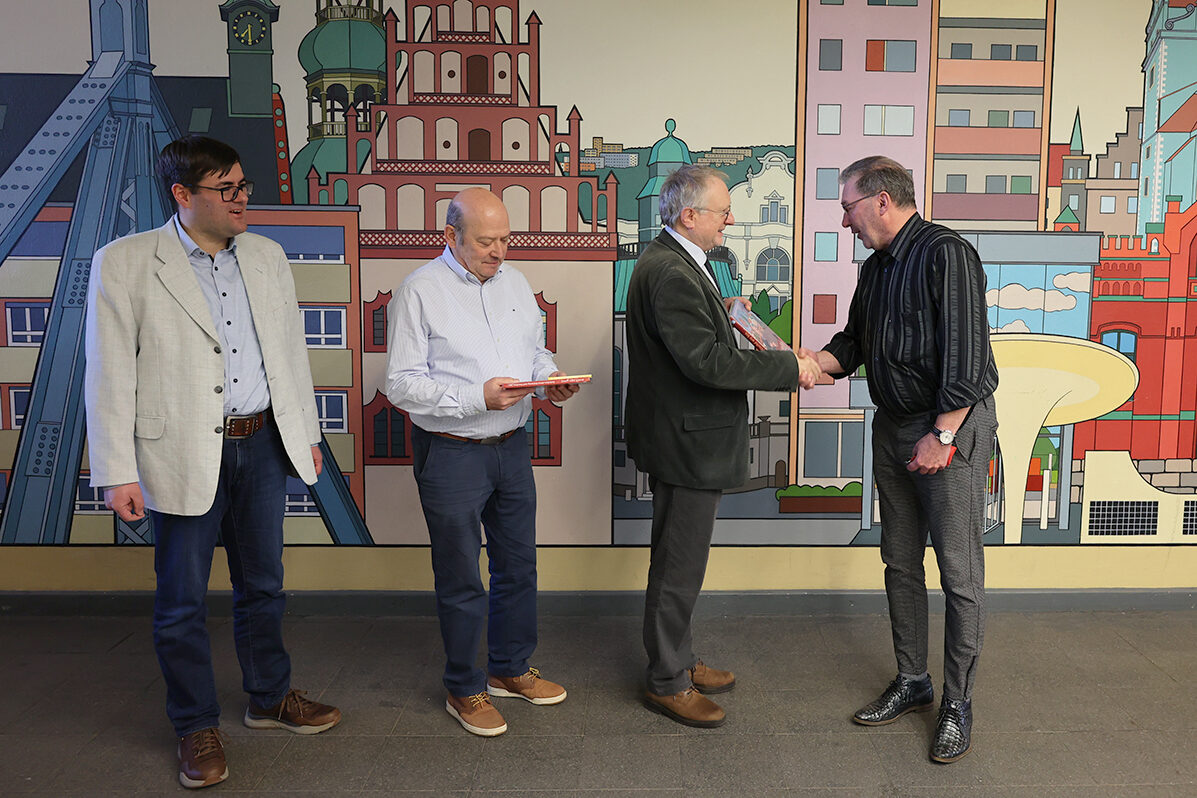 Symbolische Übergabe durch Marcel Kruppa (Leiter Amt für Familie, Schule und Soziales), Berthold Freitag (Inhaber der Buchhandlung Marx) und Dr. Michael Löffler (Leiter Kulturamt Stadt Zwickau) an Jens Heinzig, Schulleiter der Pestalozzioberschule (v.l.n.r.), der die drei Publikationen stellvertretend für die Zwickauer Schulen und Gymnasien entgegen nahm.
