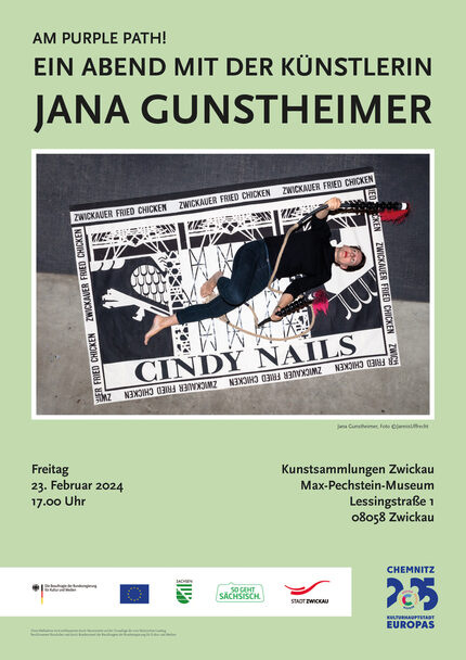 Mit Blick auf die Initiative „Chemnitz Kulturhauptstadt Europas 2025“ findet am 23. Februar, ab 17 Uhr, eine Veranstaltung in den KUNSTSAMMLUNGEN ZWICKAU Max-Pechstein-Museum (Lessingstraße 1) statt. Alexander Ochs, der Kurator des PURPLE PATH, spricht an diesem Tag mit Jana Gunstheimer über ihre Arbeit. Wie in der Einladung zu diesem Gesprächsabend angekündigt wird, wird der Kurator mit der Künstlerin u. a. über Milch und Moelk, über ihre Besuche im Arzgebirg, wie sie es nennt und ihre Lust, darüber mal eine größere Ausstellung zu schaffen, plaudern. Der Eintritt für den Abend ist frei.