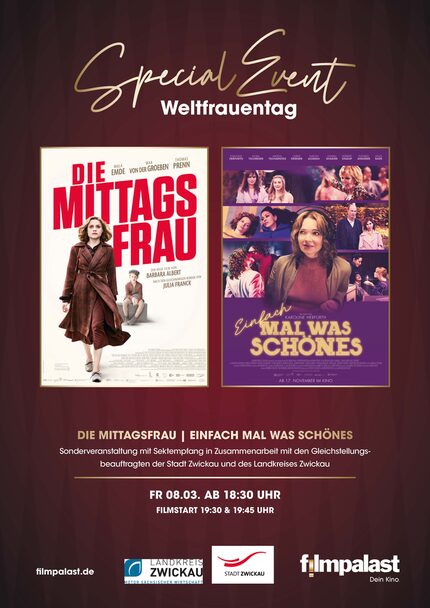 Die Gleichstellungsbeauftragten der Stadt und des Landkreises Zwickau, Ulrike Lehmann und Birgit Riedel, haben auch in diesem Jahr wieder gemeinsam mit dem Filmpalast Astoria ein besonderes Frauentags-Filmerlebnis vorbereitet: „Das Kino ist eine Frau“. Weil es bisher so gut angenommen wurde, gibt es das Veranstaltungsformat nun schon zum dritten Mal in Folge.