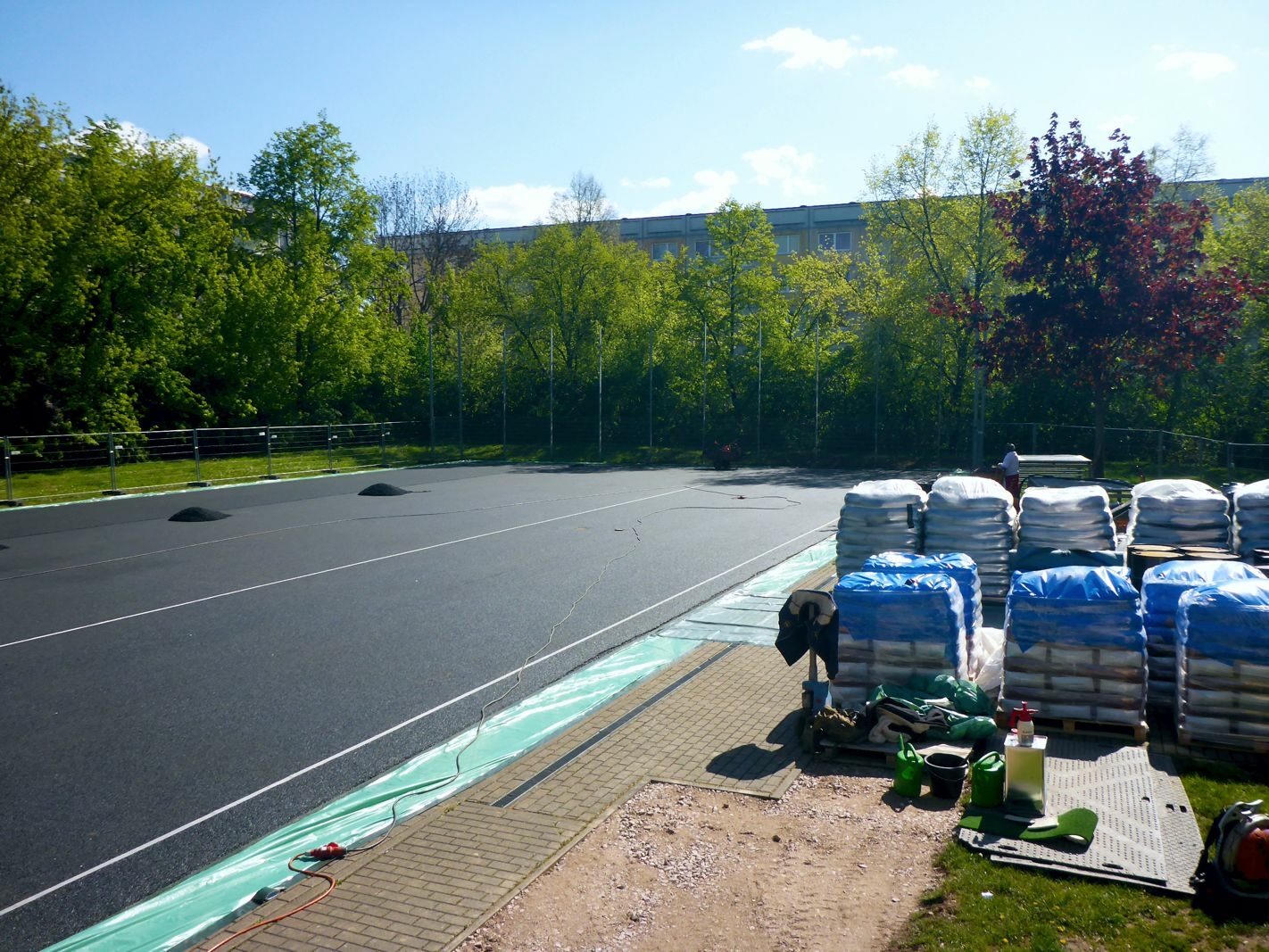 Die vorbereitenden Landschaftsbauarbeiten sind bereits abgeschlossen. Der verschlissene Kunststoffbelag aus dem Jahr 2000 wurde entfernt und die Grundfläche aus Dränasphalt für die Neubeschichtung vorbereitet.