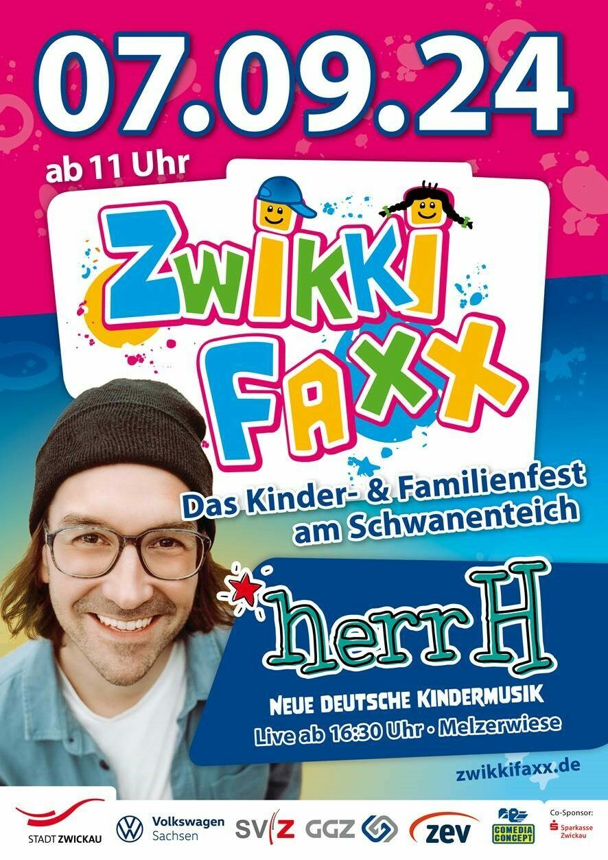 ...heißt es ab 16.30 Uhr auf der Kinderbühne. Und deshalb sollten sich möglichst alle ZWIKKIFAXX-Besucher bis dahin wieder vor der Bühne auf der Melzerwiese eingefunden haben. Ab 16.30 Uhr startet dort als Höhepunkt und Abschluss eine richtige Superfete: herrH ist da! Viele Kinder und Erwachsene kennen diesen Ausnahmekünstler und Experten für fantastische KinderMitmachKonzerte für die ganze Familie sicherlich schon. Vor zwei Jahren trat er zum Stadtfest Zwickau auf der Kinderbühne am Pulverturm auf. Seinerzeit bildete sich nach dem Konzert eine lange Schlange, weil sich viele seiner neuen Fans ein Autogramm und ein Selfie abholen und dabei auch mindestens eine CD mitnehmen wollten. Deshalb ist bei seinem erneuten Auftritt in Zwickau durchaus damit zu rechnen, dass viele Kinder textsicher beim Mitträllern seiner Lieder sind, ob sie nun von Raffi, der Giraffe mit dem unendlich großen Herzen für all ihre Freunde, von Emma der Ente, die ewig verpennte oder vom putzigen Pinguin handeln. Der kreative Musiker und Familienpapa weiß: „Musik ist für die kindliche Entwicklung elementar. Sie ist so wichtig, wie umarmt zu werden und ist ein echter Emotionsbooster...“ Überschäumende Mitmach- und Lebensfreude sowie fröhliches Popo-Wackeln sind beim mitreißenden Auftritt dieses Künstlers garantiert und das ganz bestimmt nicht nur bei den Kindern! Er ist der Garant dafür, dass alle ZWIKKIFAXX-ler beseelt nach Hause gehen und vielleicht sogar von diesem unvergesslichen Tag noch ein bisschen träumen.