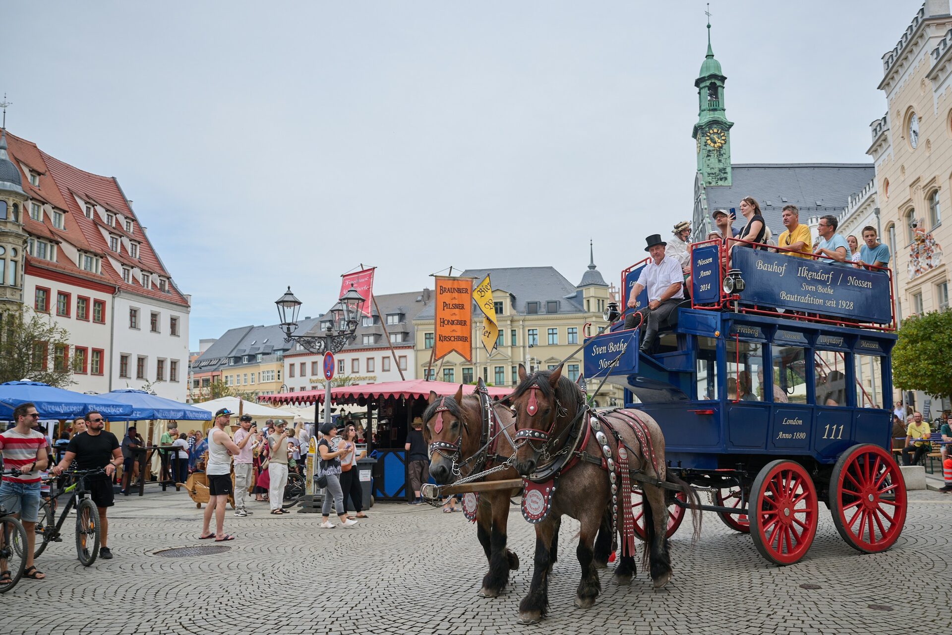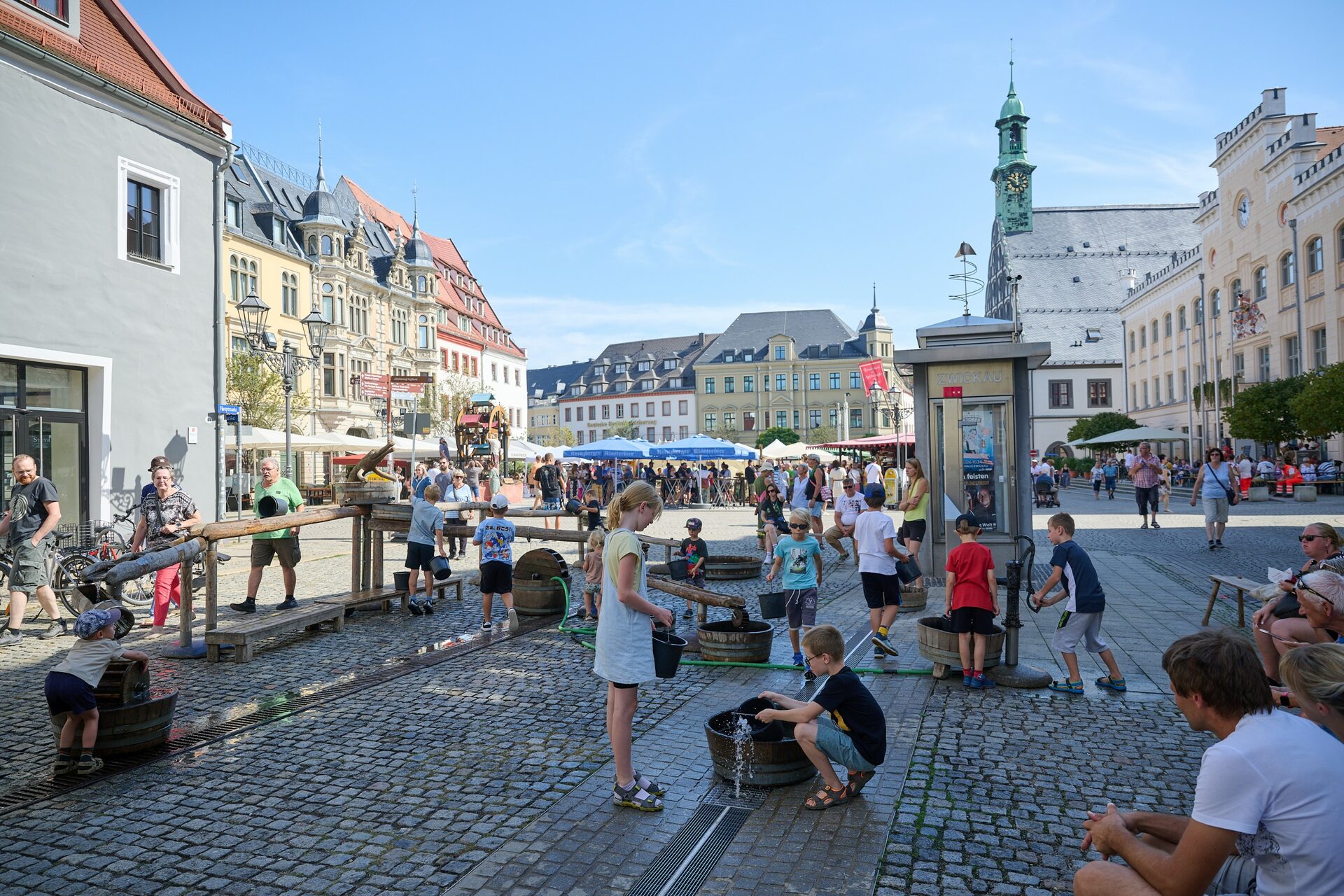 Im Robert-Schumann-Haus sorgten zum Beispiel das offene Volksliedersingen oder auch die kleinen Konzerte auf den historischen Instrumenten in der Dauerausstellung für besondere Musikerlebnisse. Fahrten mit dem historischen Pferdeomnibus oder der Pferdekutsche waren bereits am zeitigen Nachmittag für den Tag ausverkauft. Das Highlight für die kleinsten Besucher war auf jeden Fall der Wasserspielplatz auf dem Hauptmarkt – bot er gerade bei diesem Wetter eine kleine Abkühlung. Aber auch beim Bemalen und Verzieren von Kerzen konnten die Kinder ihrer Fantasie freien Lauf lassen. Geigenbaumeisterin, Papierherstellung und die Töpferei boten vor allem einen Einblick in das jeweilige Kunsthandwerk.