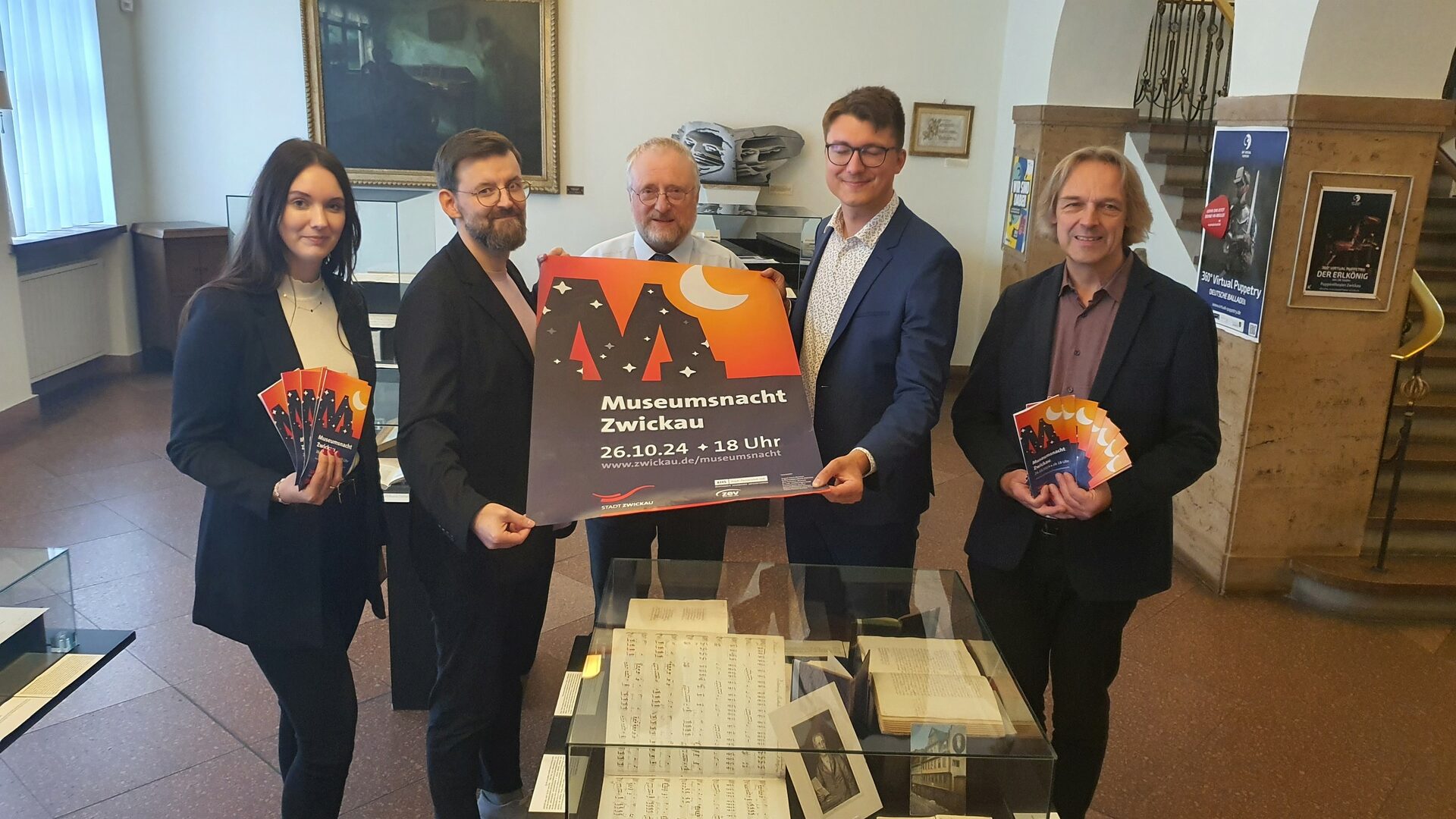 Freuen sich auf die Museumsnacht (v.l.n.r.): Lisa Schreiber (Kulturamt), Dominik Wirth (ZEV), Dr. Michael Löffler (Kulturamt), Julius Gerisch (KMS), Dr. Thomas Synofzik (Robert-Schumann-Haus)
