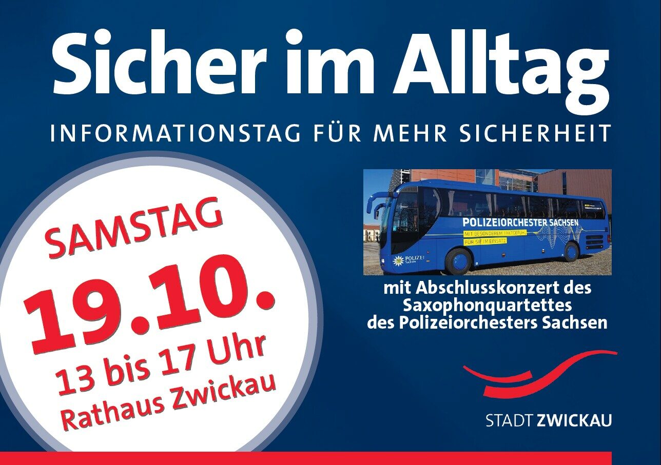 Am Samstag, dem 19.Oktober findet von 13 bis 17 Uhr der jährlich wiederkehrende Informationstag für mehr Sicherheit im Rathaus statt. Als besonderes Highlight der Veranstaltung ist zum Abschluss ab 16.15 Uhr ein Konzert des Saxophonquartettes des Polizeiorchesters Sachsen geplant. Das Repertoire des Ensembles reicht von klassischen Adaptionen, romantischen Stücken über Jazz bis hin zu moderner Popmusik.