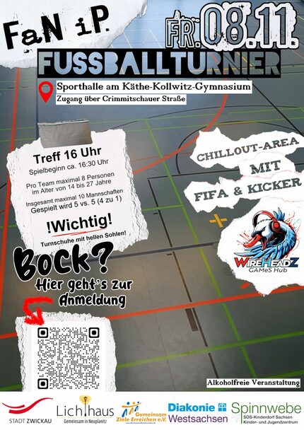 Wer mitmachen möchte, kann den QR-Code auf dem Plakat nutzen oder sich per E-Mail oder telefonisch bis spätestens Donnerstag, 7. November 2024 in einer der teilnehmenden Einrichtungen anmelden. Sofern noch freie Plätze verfügbar sind, ist das kurzfristig auch noch am Tag des Turniers bis spätestens 16.15 Uhr direkt vor Ort möglich.