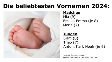 Im Jahr 2024 wurden im Standesamt der Stadt Zwickau insgesamt 836 Geburten beurkundet, 419 davon wurden für Mädchen und 417 für Jungen ausgestellt. 566 Eltern gaben ihrem Kind einen Vornamen, 251 entschieden sich für zwei und 17 Kinder erhielten drei Vornamen. (Hinweis: Die hier entstandene Differenz zwischen den Geburten und den vergebenen Vornamen von genau 2 ergibt sich aus der Vergabe von Namensketten, die im Fachverfahren „AutiSta“ nicht als einzelner Vorname gewertet werden.)