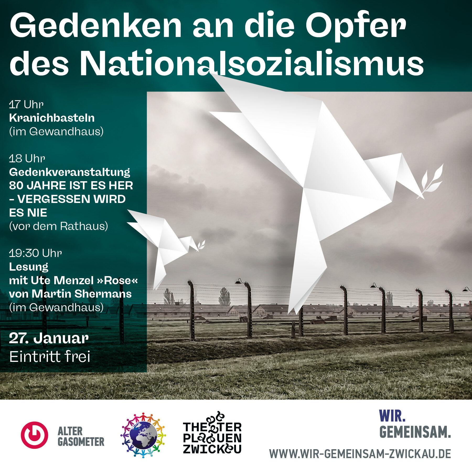 Bereits um 17 Uhr besteht die Möglichkeit, im Gewandhaus Kraniche zu falten. Bei der Gedenkveranstaltung um 18 Uhr gibt es Redebeiträge von Dr. Christian Landrock, Dr. Alexander Walther sowie Oberbürgermeisterin Constance Arndt. Schülerinnen und Schüler des KKG verlesen die Namen von Opfern aus Zwickau. Musikalische Beiträge steuern Generalmusikdirektor Leo Siberski und das Klarinettenensemble des Robert Schumann Konservatoriums bei. Um 19.30 Uhr schließt sich im Foyer des Gewandhauses Ute Menzels Lesung aus Martin Shermans Monolog „Rose“ an.