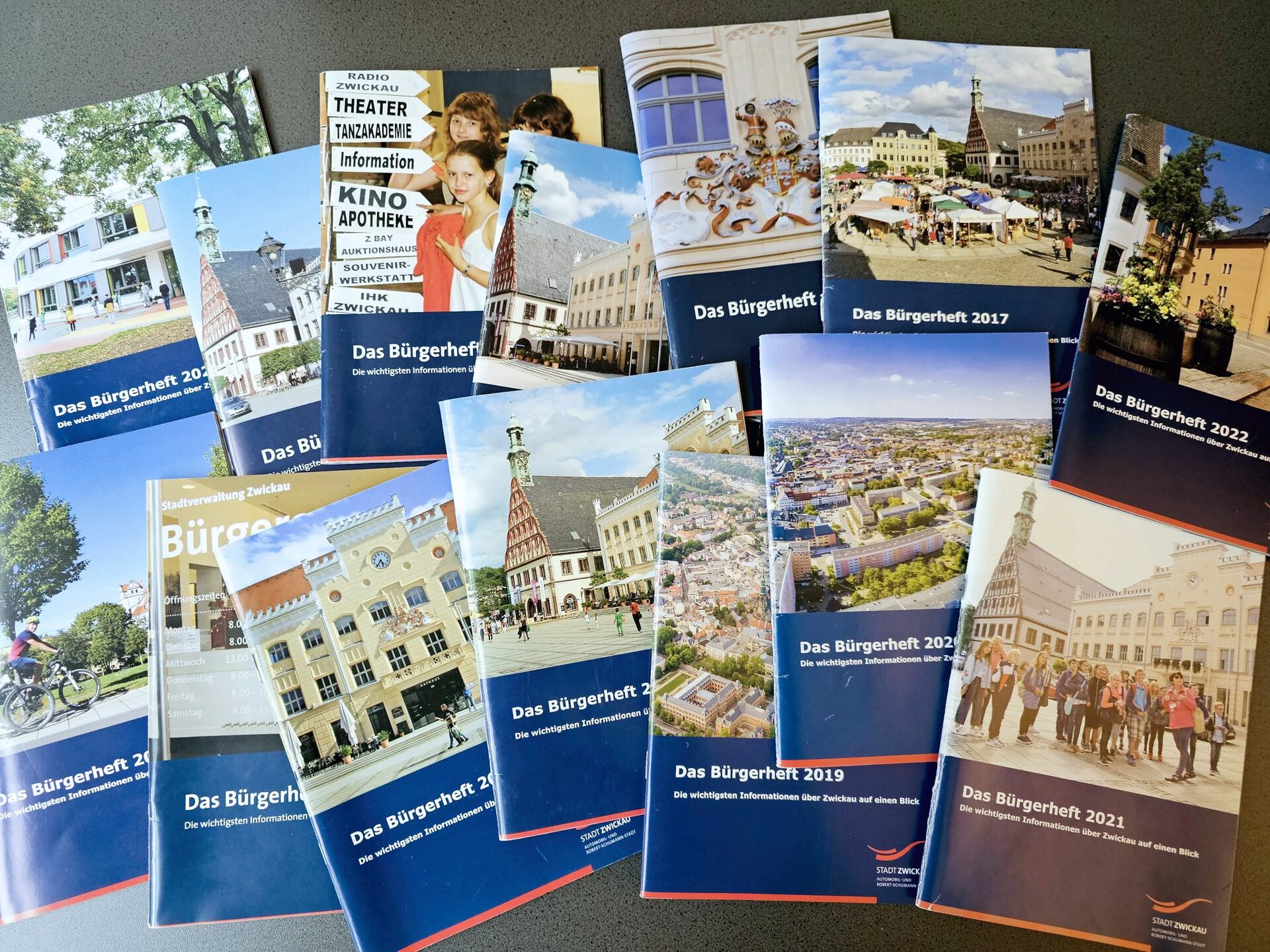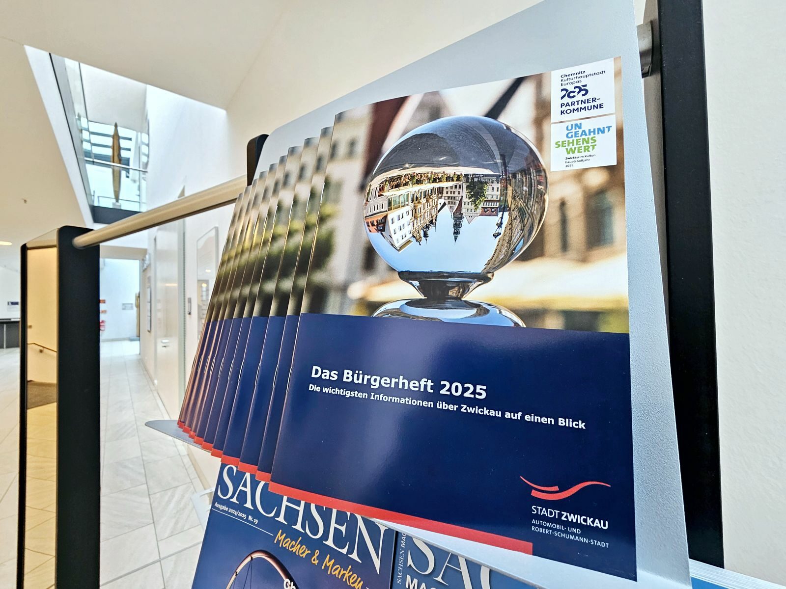 Das Bürgerheft 2025 liegt bereits im Bürgerservice im Rathaus, Hauptmarkt 1 (incl. der Auslagen im 1. OG) und in der Tourist Information Zwickau, Hauptstraße 6 kostenfrei zur Mitnahme aus.