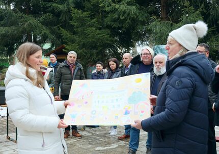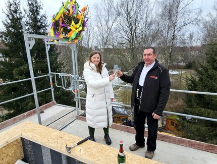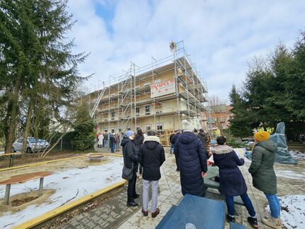 Die integrative Kita Tausendfüßler feierte gestern Nachmittag mit allem am Bau Beteiligten Richtfest. Das Gebäude wird seit August 2024 nachhaltig saniert und erweitert. Nach rund 6 Monaten Bauzeit ist jetzt ein wichtiger Bauabschnitt geschafft: das neue Dach ist fertig. Das alte Satteldach wurde komplett abgetragen und machte Platz für ein weiteres Stockwerk in Holzständerbauweise. Das neue Dach wird als Flachdach ausgeführt. Aktuell schmückt ein bunter Richtbaum das Gebäude, der vor allem ein Dankeschön an all die fleißigen Handwerker darstellt, die bisher auf der Baustelle gearbeitet haben.