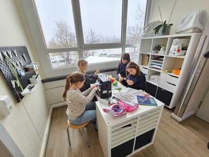 Das offene Nähzimmer kann jederzeit genutzt werden. Es bietet Platz für vier Kinder und eine näherfahrene Erzieherin, die den Kids mit Rat und Tat zur Seite steht. Nähen ist natürlich keine Pflicht. Die Kinder können auch einfach nur mit Wolle arbeiten, d.h. stricken, sticken, häkeln und weben. Freya, Mathilda, Toni und Siva macht auch die Herstellung neuer Freundschaftsbänder sichtlichen Spaß. Die 9-jährigen Mädchen sind Schülerinnen der nahegelegenen Grundschule Am Scheffelberg und lieben ihr neues Nähzimmer, aber auch die anderen tollen Angebote im Hort, denn im „Wichtelhaus“ ist jede Menge los. Hier gibt es auch eine Chor-AG, einen Wellness-Tag, eine Theatergruppe und eine Tanz-AG. Selbst Schach wird hier regelmäßig gespielt. Eine weitere Arbeitsgruppe ist bereits in Planung: Die Kids wollen demnächst ihre eigene Hort-Zeitung auflegen.