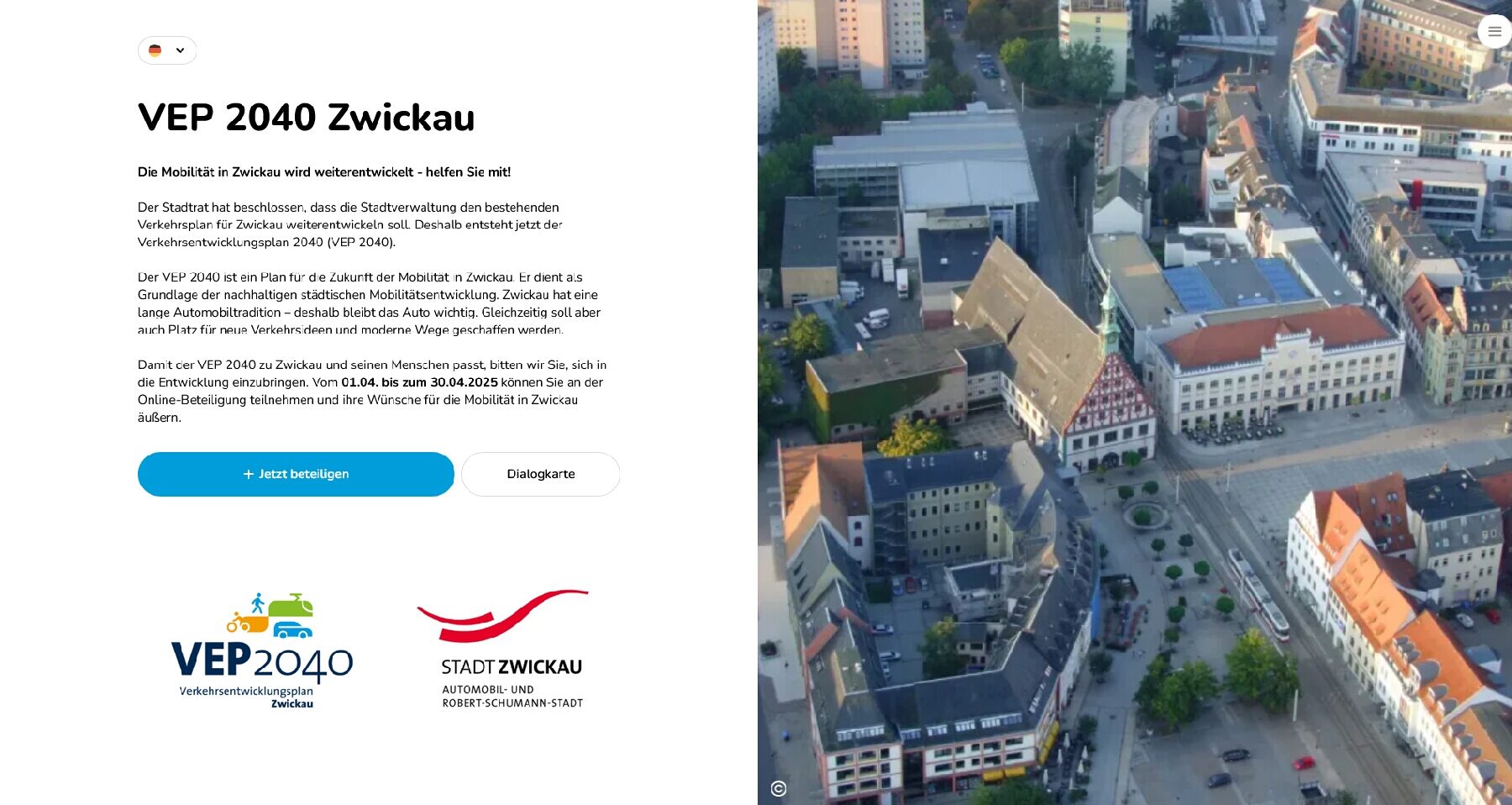 Jetzt geht die Bürgerbeteiligung in die nächste Runde. Im April ist eine Haushaltbefragung vorgesehen. Gleichzeitig erhalten alle Zwickauerinnen und Zwickauer die Möglichkeit, über ein Online-Format (www.vep2040.de) mitzuwirken. Darüber hinaus sind verschiedene Verkehrs- und Parkraumerhebungen im Stadtgebiet geplant. Im gleichen Monat finden auch die ersten Veranstaltungen im Rahmen des Mobilitätsdialogs statt.