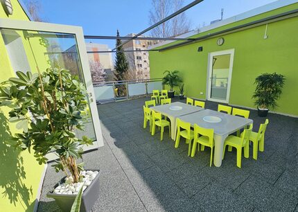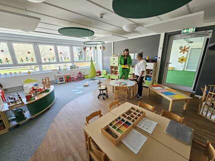 Auch die schöne Sonnenterrasse, die sich auf dem Verbindungsbau befindet, wurde auf Vordermann gebracht. Diese erhielt einen motorisierten Sonnenschutz, einen Bodenbelag aus Fallschutzmatten und ein verglastes Geländer. Damit dürfte die Terrasse an regnerischen Sommertagen für die Kinder zum Lieblingsort für Spiel und Vesper werden.