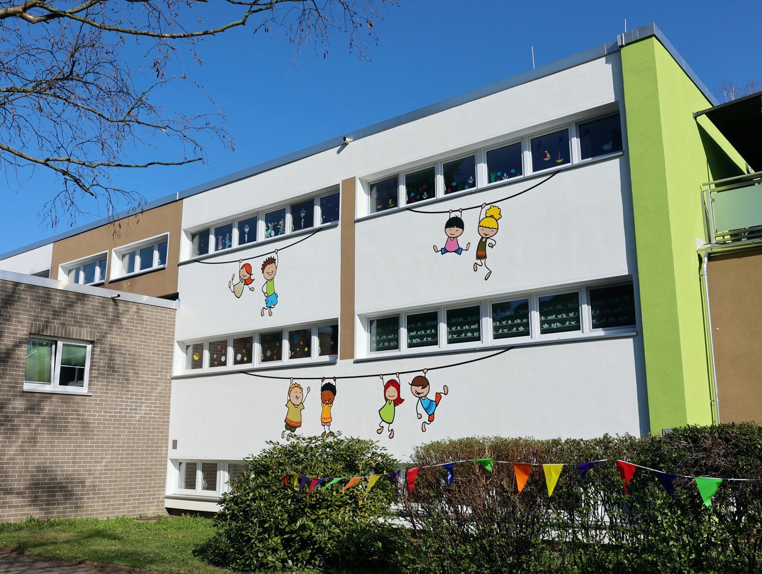 Die Kita ist nicht nur äußerlich ein farbenfrohes Schmuckstück geworden, auch im Inneren sorgt viel Neues für ein zeitgemäß-frisches Raumgefühl. Alle Gruppenräume erhielten eine neue Wandgestaltung, neue Fußböden, Handwaschbecken, Fenster und (teilweise) neue Türen. Einzelne Gruppenräume und der Bewegungsraum wurden mit den bisher noch fehlenden Schallschutzelementen ergänzt und entsprechen nun auch den DIN-Anforderungen kleinerer und mittlerer Räume. Alle Etagen verfügen zudem über neue Personaltoiletten.