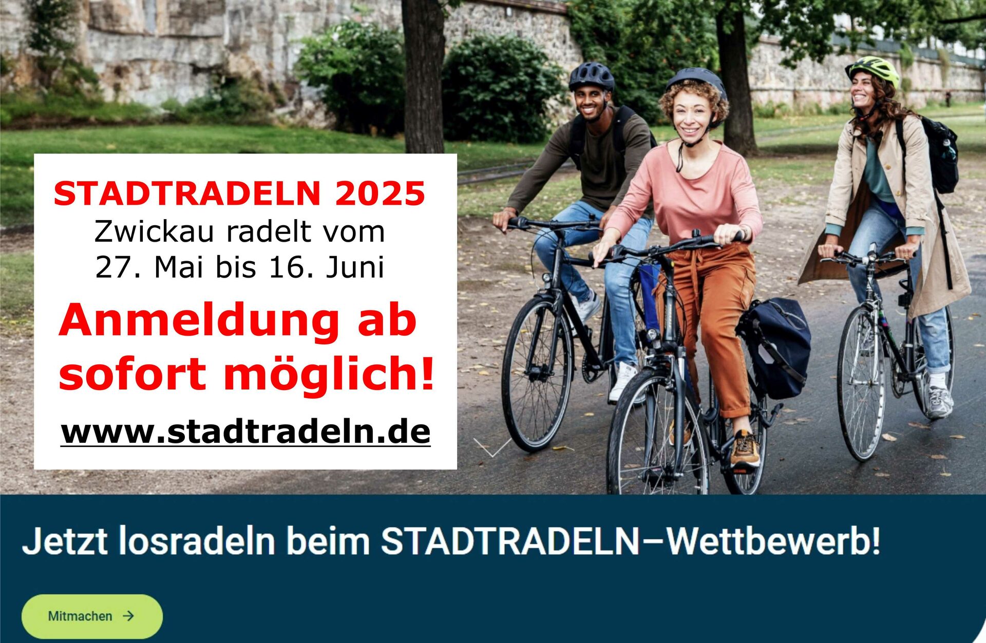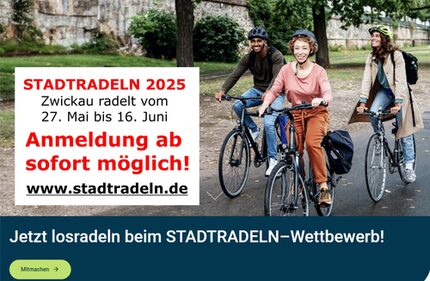 Mitmachen können alle, die in Zwickau wohnen, arbeiten, einem Verein angehören oder eine (Hoch)Schule besuchen. Zugelassen sind alle Fahrzeuge, die im Sinne der StVO als Fahrräder gelten. Ausführliche Infos zum STADTRADELN in Zwickau folgen im Mai. Allgemeine Infos rund ums STADTRADELN sind unter www.stadtradeln.de nachzulesen.