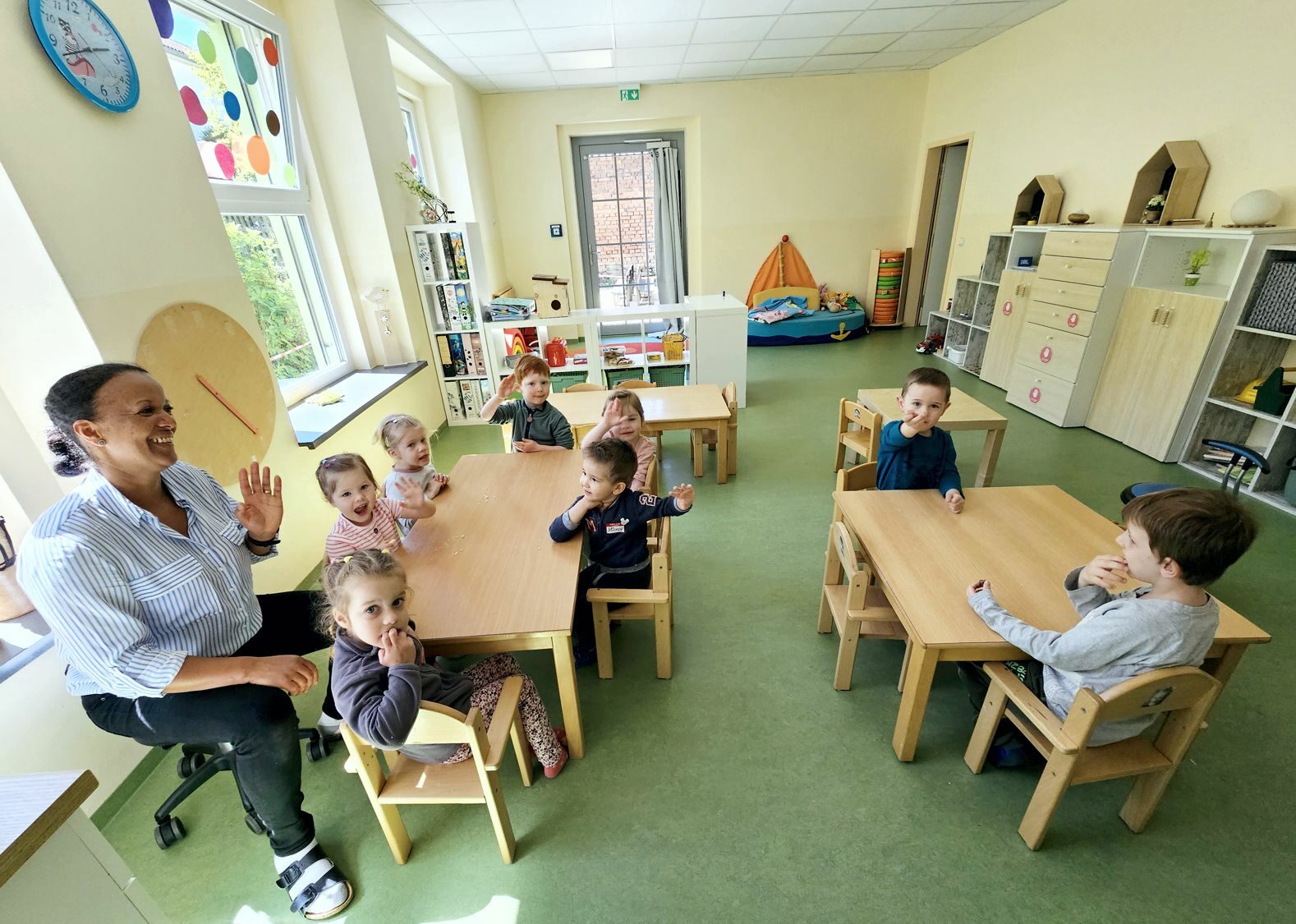 In der Kita können bis zu 90 Kinder im Alter von 1 bis 7 Jahren betreut werden, 6 davon sind Integrationsplätze für Kinder mit Handicap.