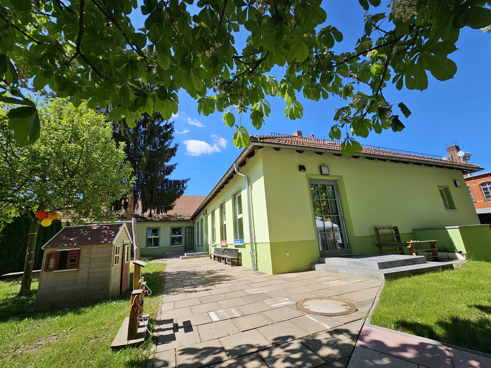 Nach den eher kleineren Veränderungen und Notwendigkeiten startete im Oktober 2023 eine umfassende Sanierung des städtischen Objektes. Einen zentralen Bestandteil der jüngsten Baumaßnahme stellte die energetische Sanierung des Gebäudes dar. Hierfür wurden zunächst die Außenwände im Kellergeschoß vertikal feuchteisoliert und die Grundleitungen erneuert. Anschließend erhielten die Fassade, Kellerdecken und Fußböden eine Wärmedämmung. Auch Wärmebrücken und undichte Stellen wurden beseitigt, die Fenster und Außentüren gegen energiesparende Elemente ausgetauscht und alle Gruppenräume mit einer Raffstore-Anlage als außenliegender Sonnenschutz versehen. Damit entsprechen die sanierten Räume den Anforderungen an den Wärmeschutz, sorgen zu jeder Jahreszeit für ein angenehmes Raumklima und begrenzen zukünftig die Verbrauchskosten auf ein Mindestmaß.