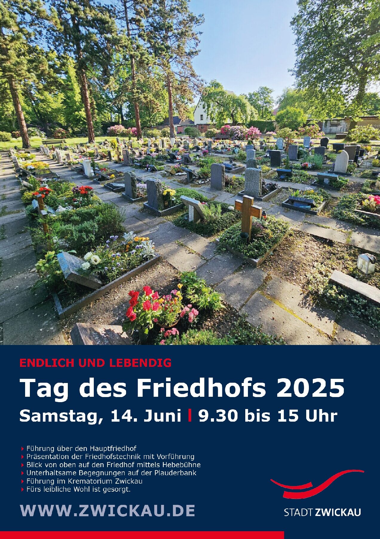 Am Samstag, 14. Juni 2025 lädt das Garten- und Friedhofsamt der Stadt Zwickau wieder zum „Tag des Friedhofs“ ein. In diesem Jahr lautet das Motto noch einmal „Endlich und lebendig“, da es bundesweit immer für zwei Jahre Gültigkeit behält. Der Tag bietet Interessierten Gelegenheit, sich rund um die Themen Friedhof und Bestattungen zu informieren und diesen Ort nicht nur als Begräbnis- und Erinnerungsstätte kennenzulernen und wahrzunehmen. Friedhöfe sind auch grüne Oasen, können als Treffpunkt genutzt werden und vermitteln ebenso Kunst, Kultur und Lokalgeschichte.
