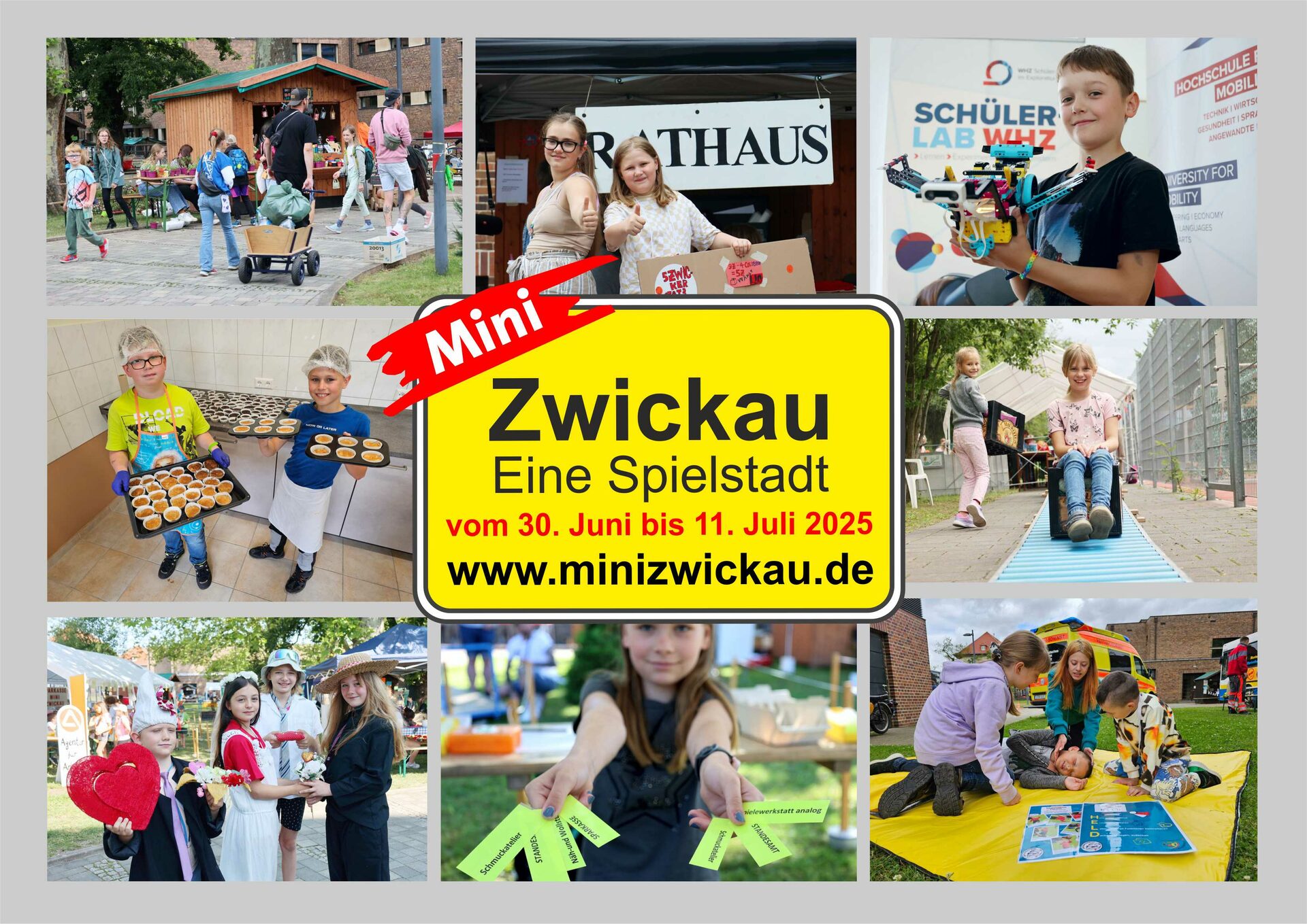 Von Montag, 30. Juni bis Freitag, 11. Juli verwandelt sich die Pestalozzischule in der Seminarstraße 3 wieder in ein zauberhaftes Spielareal und lädt alle 7 bis 14-jährigen Ferienkinder aus Zwickau und Umgebung ein, der fiktiven Stadt Leben einzuhauchen. Hier gibt es alles, was ein Kinderherz begehrt: jede Menge gut gelaunte kleine und große Menschen, ganz viel Spiel und Spaß und vor allem mega tolle Angebote. In diesem Jahr stehen insgesamt 37 Betriebe mit rund 270 Arbeitsplätzen zur Auswahl, darunter alt bewährte wie die Sparkasse Mini Zwickau, das Einwohnermeldeamt, ein Fundbüro, das Standesamt, eine Bäckerei und Gärtnerei, ein Freizeitpark und die Tonni GmbH (Müllentsorgung).