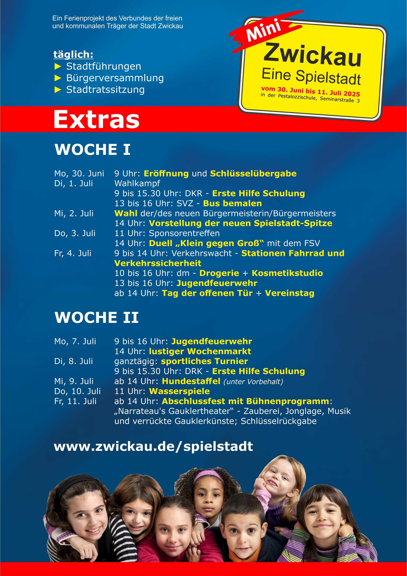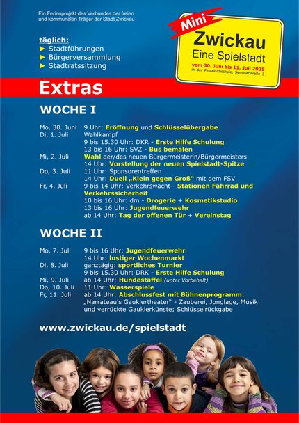 Genau wie im echten Leben sind auch in der Spielstadt verschiedene kulturelle, sportliche und politische Extras geplant. Hierzu zählen vor allem der Wahlkampf und die Wahlen, denn die Spielstadt 2025 braucht wieder eine neue Bürgermeisterin bzw. einen neuen Bürgermeister und Stadtrat. Die Spielstädter dürfen erneut einen Linienbus der SVZ bemalen, der anschließend – von Kinderhand designt - noch einige Tage im Linienverkehr durch Zwickau touren wird.