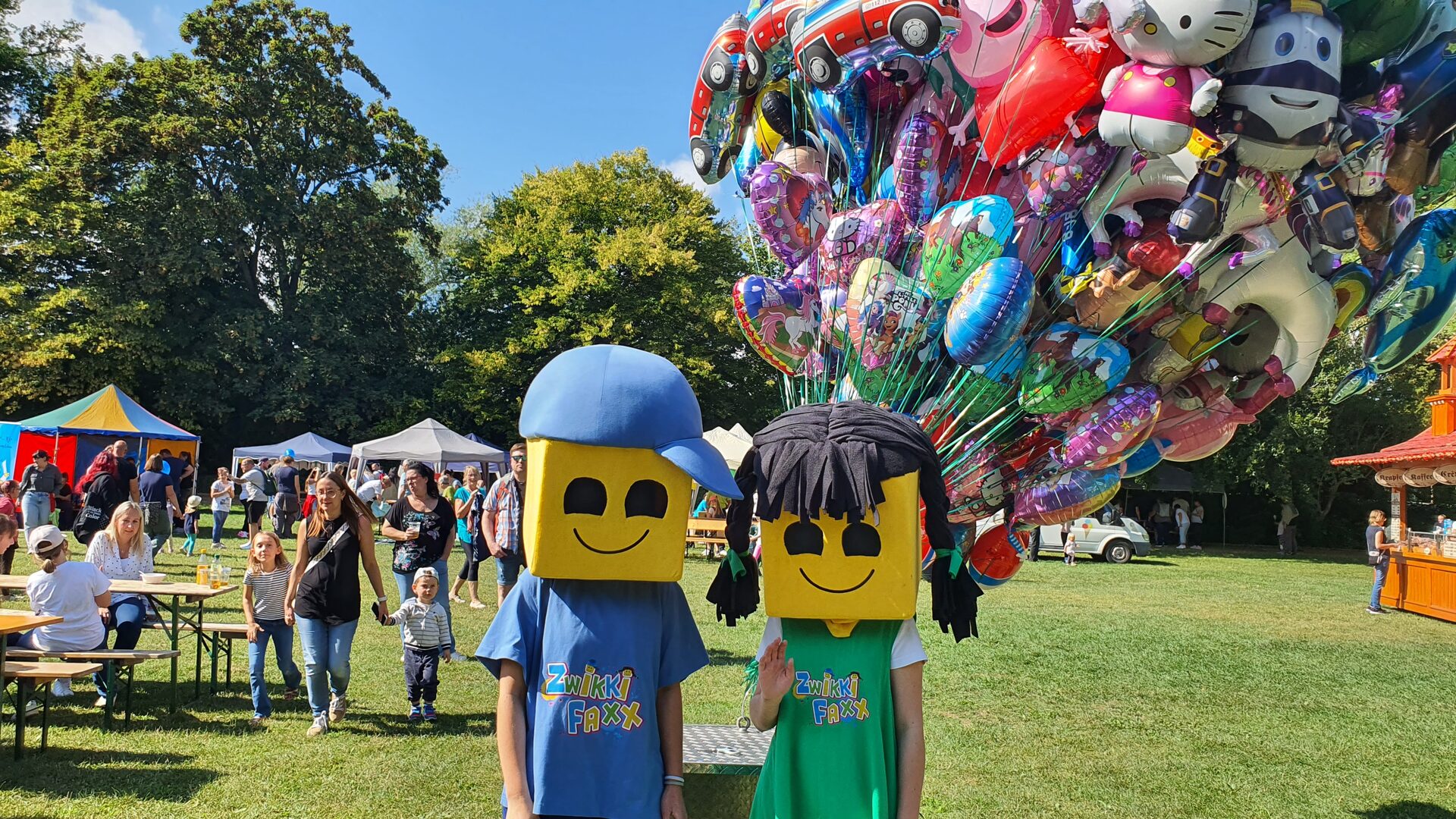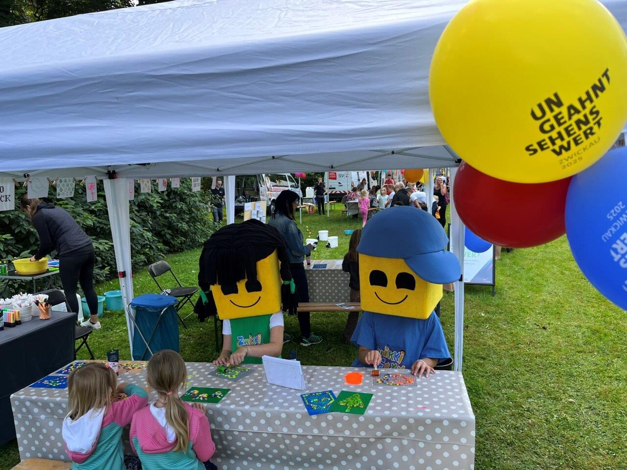Eine ganz neue Hauptattraktion hatte diesmal auch die Zwickauer Energieversorgung: statt des Klettergartens wurde eine Fernwärmebaustelle mit Häusern zum Bemalen aufgebaut. Außerdem gab es BlazePods, Minigolfspielbahn, Tischkicker, Experimentierstation, Energie-Quizrad, Windspielbasteln, bunte Stempelbäume und wie an vielen Stellen rund um den Schwanenteich papageienbunte Kindertattoos. Die ZEV gehört zu den aktiven ZWIKKIFAXX-Unterstützern, deren Mitarbeiter schon in den sehr frühen Morgenstunden alles auf ihren Wiesen platzierten. Früh starteten auch die Mitstreiter vom ZWIKKIFAXX-Unterstützer Volkswagen Sachsen, die auf der Kranichwiese u. a. mit Riesenrutsche, Wipe Out, Riesendart und natürlich mit zwei VW-Fahrzeugen zum Bemalen für großen Besucherandrang sorgten. Auch die Gebäude- und Grundstücksgesellschaft Zwickau, die als Unterstützer der ersten Stunde unverzichtbare Beiträge zum Gelingen des größten Kinderfestes der Region leistete, wusste mit ihren Angeboten wieder zu überraschen: neben einem GGZ-Hüpfhaus gab es für alle kleinen Abenteurer eine von Anfang an sehr begehrte kunterbunte Parcours-Station u. a. mit Wackelbrücken.