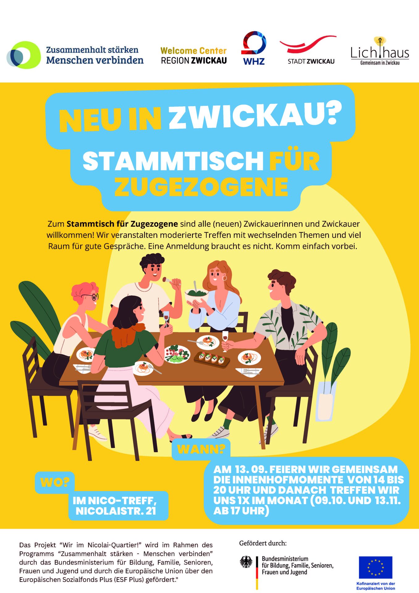 Neu in Zwickau? Dann dürfte der neue Stammtisch für Zugezogene das Richtige sein! Das offene Treffen richtet sich an alle Menschen, die neu in der Stadt sind und Lust haben, sich zu vernetzen, ins Gespräch zu kommen und die Stadt besser kennenzulernen. Der Stammtisch, der im Nico-Treff stattfindet, bietet moderierte Treffen mit wechselnden Themen und viel Raum für gute Gespräche. Eine Anmeldung ist nicht erforderlich.