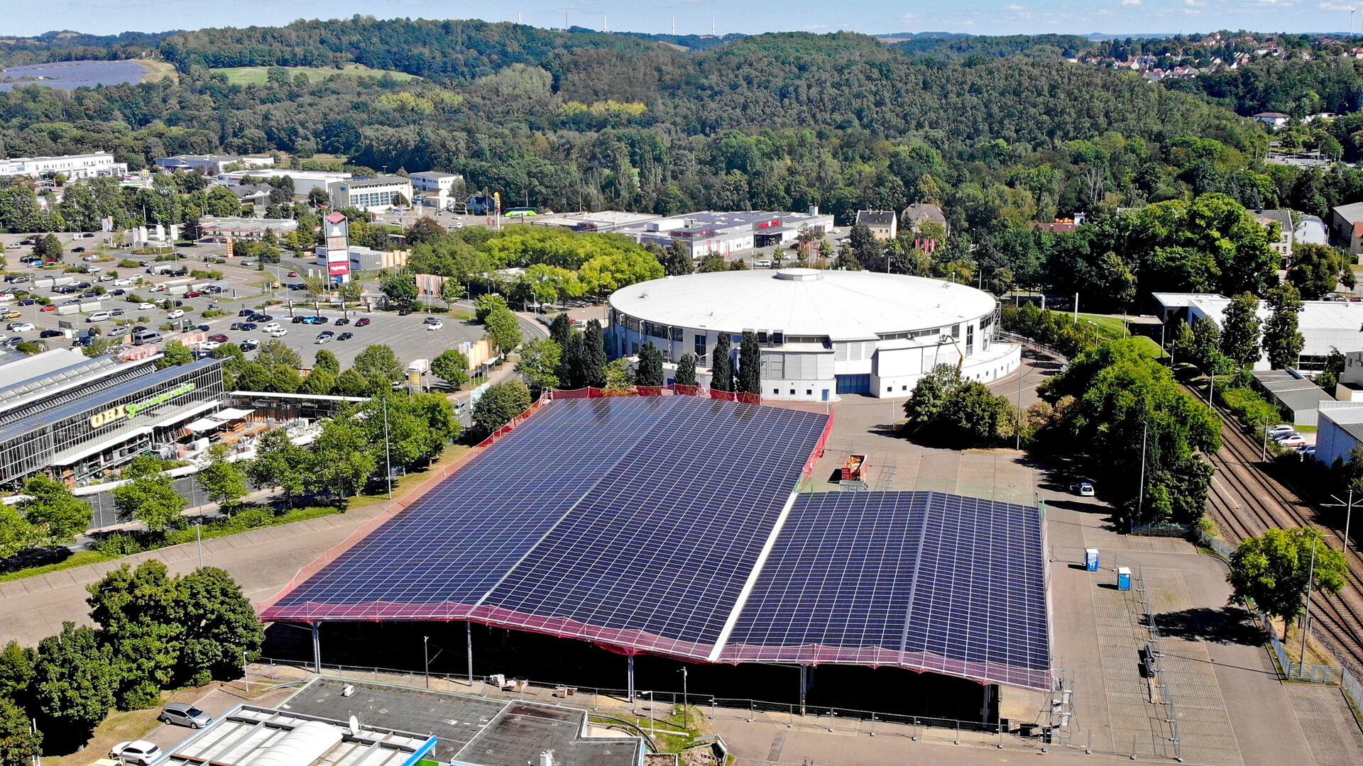 Die neue PV-Anlage umfasst eine Fläche von 5.352 m2 und bietet eine Durchfahrtshöhe von mindestens 4,50 m. Mit einer installierten Leistung von 998 kWp können jährlich rund eine Million Kilowattstunden Strom erzeugt werden. Damit deckt die Stadthalle einen wesentlichen Teil ihres eigenen Energiebedarfs und erfüllt zugleich die Anforderungen eines modernen Veranstaltungsbetriebs.