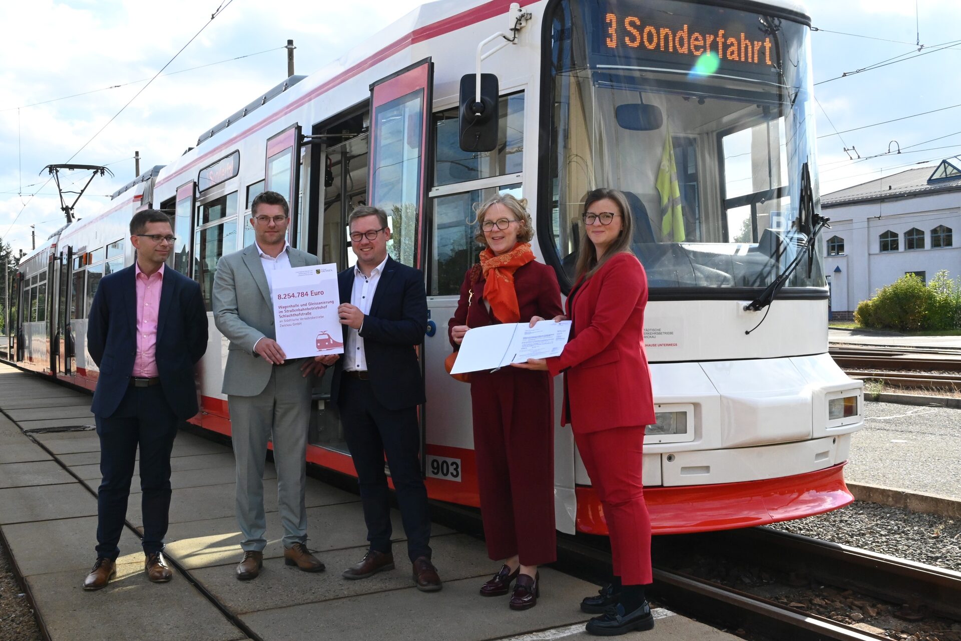 Die Städtische Verkehrsbetriebe Zwickau GmbH (SVZ) hat gestern einen Fördermittelbescheid in Höhe von rund 8,25 Mio. Euro erhalten. Mit den Mitteln soll insbesondere der Bau einer Wagenhalle für Straßenbahnen im Betriebshof in der Schlachthofstraße gebaut werden. In der Halle sollen künftig bis zu 20 Straßenbahnzüge untergebracht werden. Den Bescheid überreichte Staatsministerin Regina Kraushaar an die Geschäftsführer der SVZ, Steve Preißner und Sebastian Eßbach.