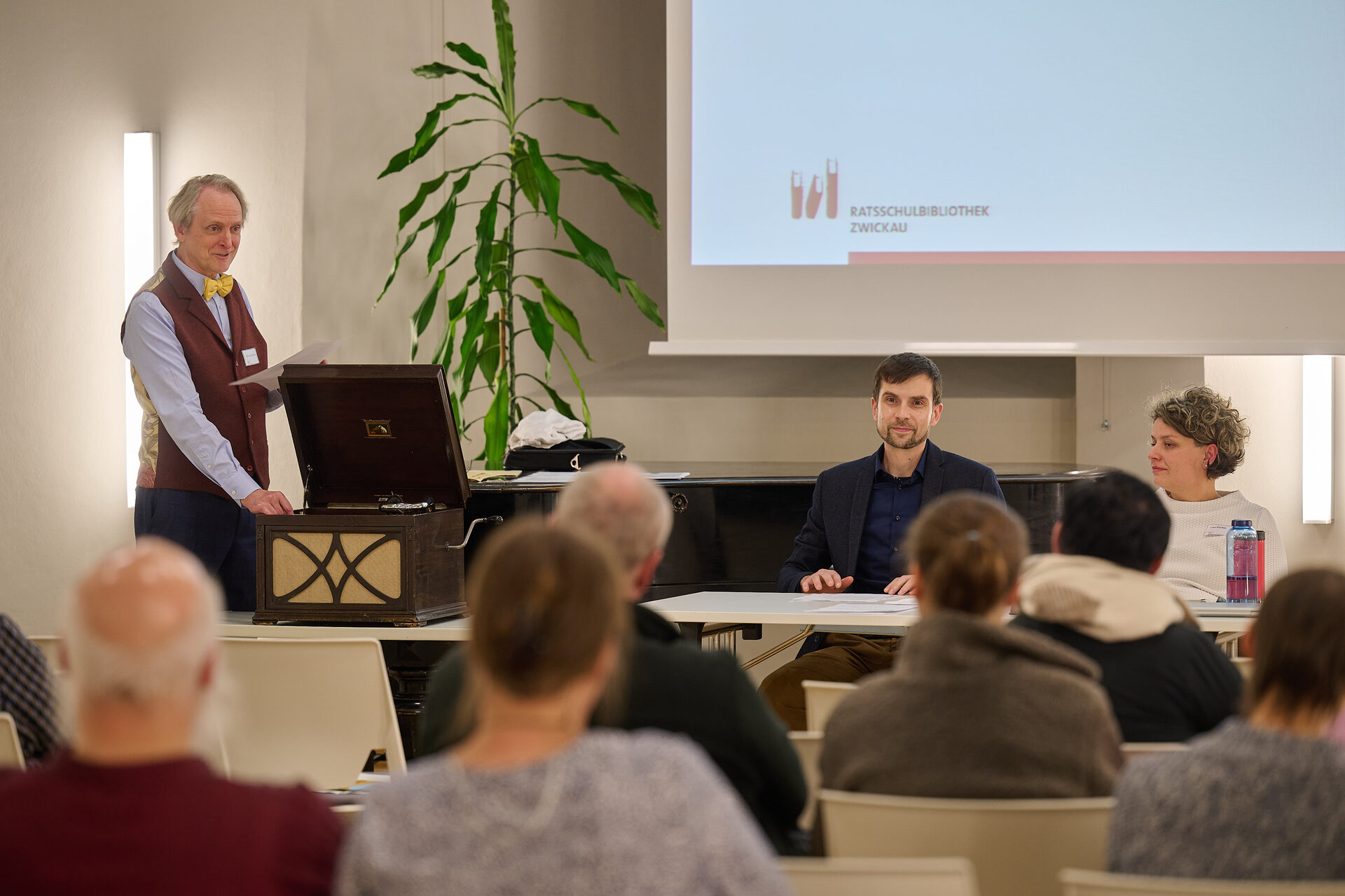 In diesem Jahr musste die Bibliothek mit allem Inventar ihr angestammtes Domizil in der Lessingstraße baubedingt verlassen und zog in das Zwickauer Verwaltungszentrum an der Werdauer Straße. Im Rahmen des Umzuges traten so einige kuriose Schätzchen und Fakten zu Tage, die im Saal der Stadtbibliothek zum Besten gegeben wurden. So fand sich ein reicher Fundus an Werbung – Reklame – der 1920er- und 1930er-Jahre, die mit passender Musik von Schellack-Platten auf dem Grammophon untermalt wurde und nicht selten für ein Schmunzeln und Lacher im Publikum sorgten.