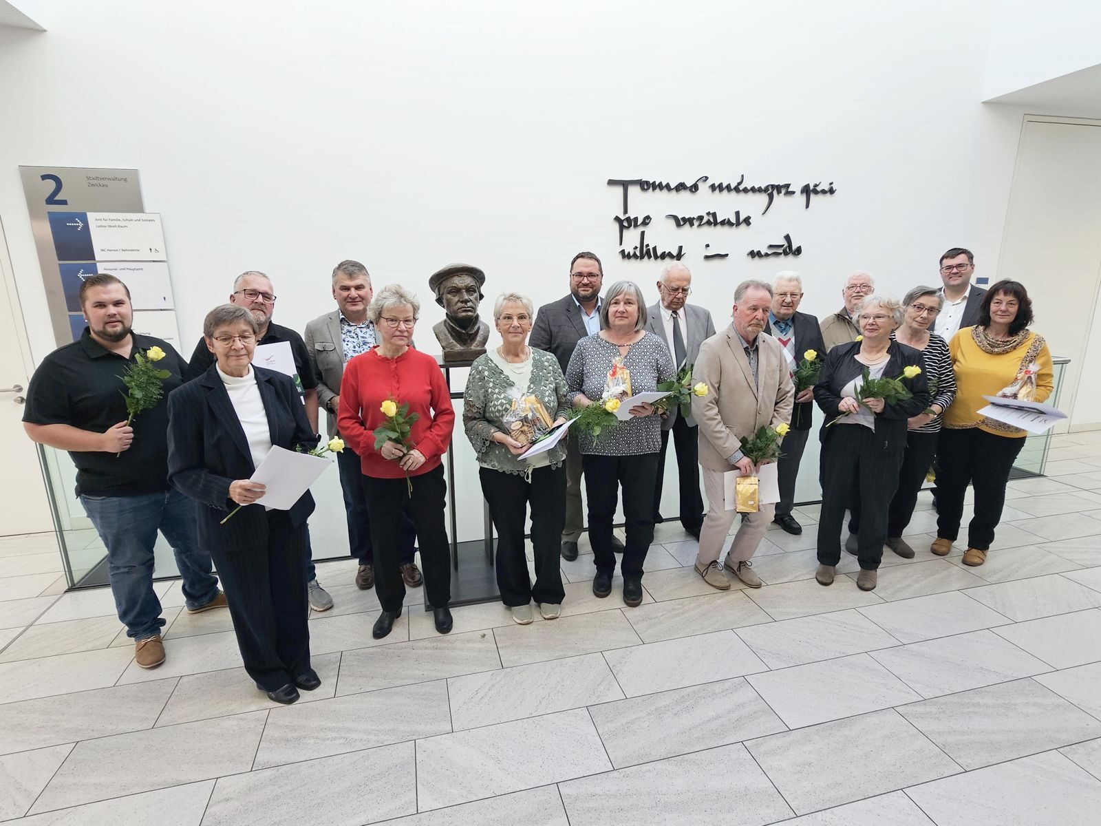 Bereits am 30. Oktober fand die feierliche Auszeichnung ehrenamtlich Tätiger in der Stadt Zwickau statt. Sebastian Lasch (Bürgermeister für Finanzen und Ordnung), Marcel Kruppa (Leiter des Amtes für Familie, Schule und Sport) und Kathrin Fiebig (Vorsitzende der Seniorenvertretung Zwickau) empfingen die 10 Auszuzeichnenden und drei Vertreter der Ehrenamtsgruppen zu einer kleinen Feierstunde im Rathaus. Die Frauen und Männer erhielten neben herzlichen Worten des Dankes für ihr soziales Engagement auch eine Urkunde der Oberbürgermeisterin, ein kleines Präsent mit Blume und je zwei Eintrittskarten für das Theater Plauen-Zwickau.