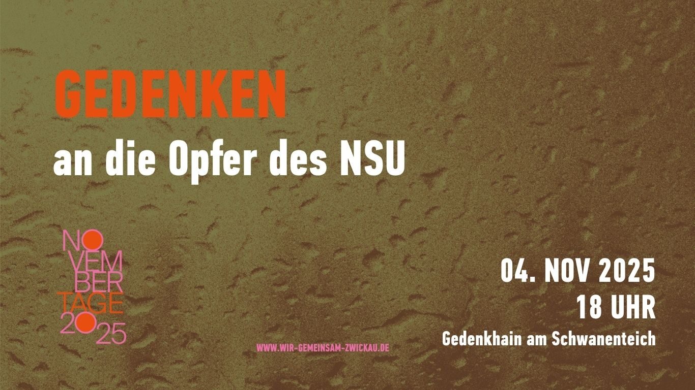Am Dienstag, dem 4. November findet eine Mahnmache zum Gedenken an die Opfer des Nationalsozialistischen Untergrundes (NSU) statt. Mit der Veranstaltung, die um 18 Uhr an den Gedenkbäumen im Schwanenteichpark beginnt, soll insbesondere an die zehn Ermordeten erinnert, auf die Folgen rechtsextremen Terrors aufmerksam und die Solidarität mit den Hinterbliebenen ausgedrückt werden.