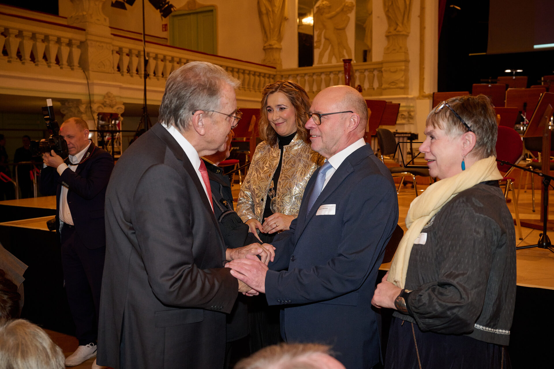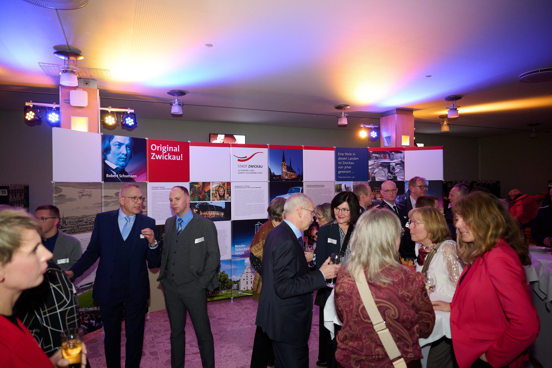 Die Möglichkeit, im Foyer bei einem kleinen Imbiss miteinander ins Gespräch zu kommen und Kontakte zu pflegen, nutzten dann etliche der Gäste. Zu diesen zählten die Ehrenbürger Jürgen Croy, Bernd-Lutz Lange und Rainer Eichhorn. Dessen beiden Nachfolger im Amt des Oberbürgermeisters, Dietmar Vettermann und Dr. Pia Findeiß, waren ebenfalls anwesend. Zu den Gästen zählten weiterhin u. a. Bundes- und Landtagsabgeordnete, Landrat Carsten Michaelis sowie Oberbürgermeister und Bürgermeister des Landkreises. Vertreter von Vereinen und Verbänden, von kommunalen Gesellschaften und Zweckverbänden, von Freiwilligen Feuerwehren und Hilfsorganisationen sowie zahlreiche Unternehmer und weitere Persönlichkeiten machten die Vielfalt der geladenen Gäste aus. Aus der tschechischen Partnerstadt Jablonec nad Nisou war Bürgermeisterin Jana Hamplová angereist, und aus Volodymyr Mitarbeiterinnen der Stadtverwaltung, die sich derzeit zu einem Arbeitsbesuch in der Automobil- und Robert-Schumann-Stadt aufhalten.