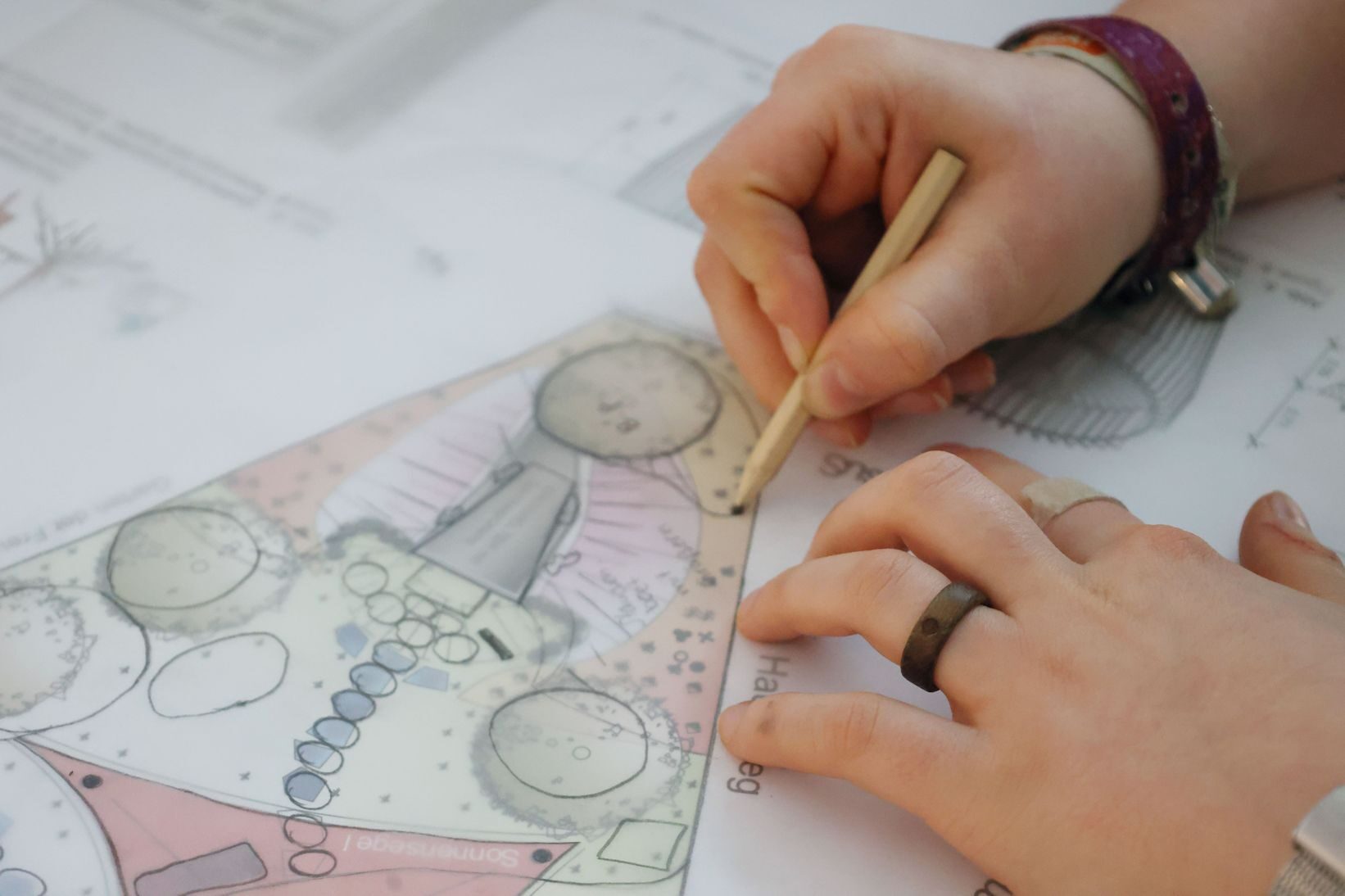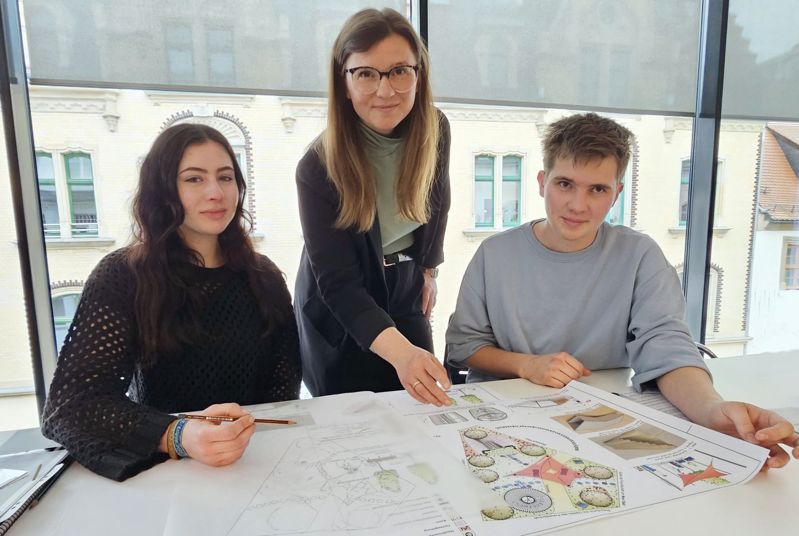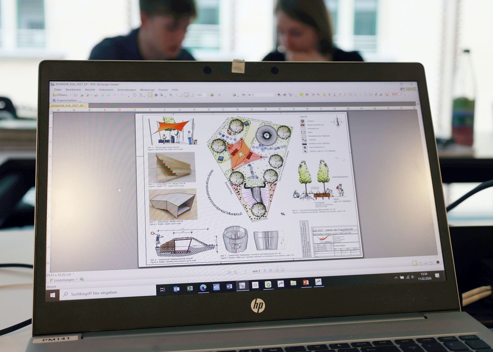 Jetzt holte sich das Garten- und Friedhofsamt mit den eigenen Auszubildenden junge Mitstreiter ins „IGA-Team“, um der Entwurfsplanung einen jugendlich-zeitgemäßen Feinschliff zu geben. Bei den jungen Erwachsenen handelt es sich um Auszubildende im Garten- und Landschaftsbau im 2. und 3. Lehrjahr, zwei Jungfacharbeiter und einen Facharbeiter. Das Mitwirken im Projekt vereint Theorie und Praxis und ermöglicht den jungen Menschen, bereits Erlerntes anzuwenden, sich mit eigenen Ideen einzubringen und ein städtisches Projekt mit Außenwirkung vom Entwurf bis hin zur Umsetzung und Präsentation zu begleiten.