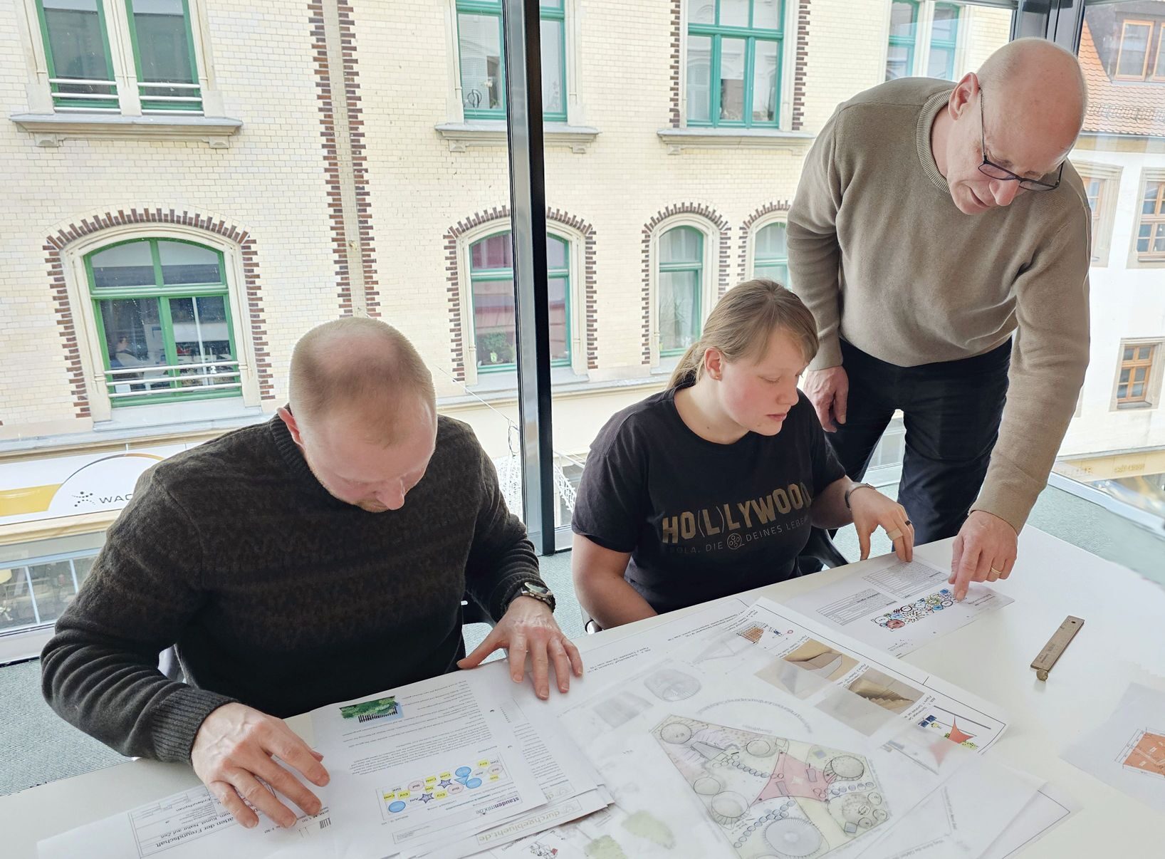 In einem Workshop, der kürzlich im Zwickauer Rathaus stattfand, stellten die jungen Auszubildenden und Facharbeiter ihre Entwürfe und Ideen vor und arbeiteten anschließend gemeinsam an der Optimierung des städtischen Grundentwurfs. Kompetente Unterstützung erhielten sie dabei von ihrem Praxis-Ausbilder Tilo Küttler (Garten- und Friedhofsamt/SB Bauleistungen) und dem Leiter des IGA-Projektes Carsten Allert (Garten- und Friedhofsamt/Landschafts- und Objektplanung).