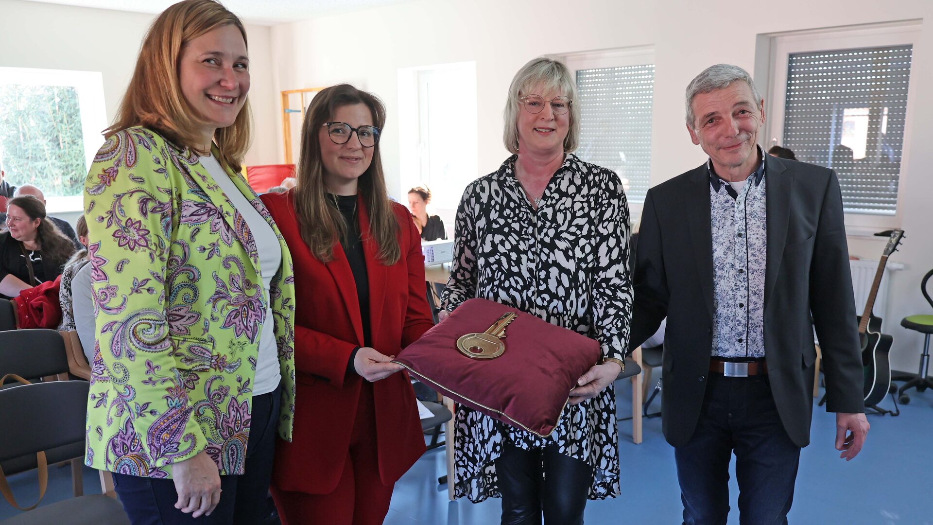 Symbolische Schlüsselübergabe (v.l.n.r.): Oberbürgermeisterin C. Arndt, Baubürgermeisterin S. Queck, Leiterin S. Röhrborn, H. Melle (Kinderhausverein)
