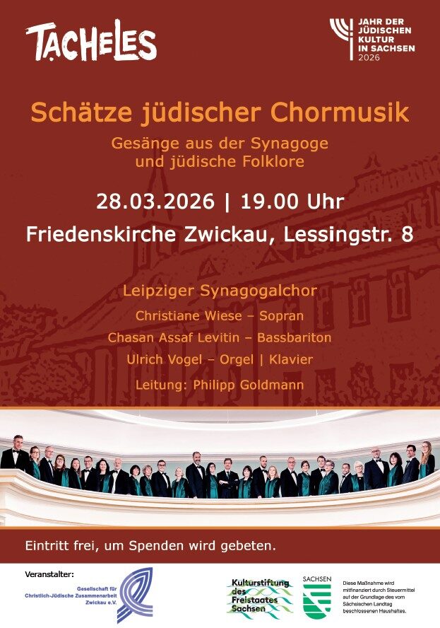 Im Rahmen des Jahres der Jüdischen Kultur in Sachsen lädt die Gesellschaft für Christlich-Jüdische Zusammenarbeit Zwickau e. V. am Samstag, dem 28. März um 19 Uhr zu einem besonderen Konzert ein. Unter dem Titel „Schätze jüdischer Chormusik“ gastiert der Leipziger Synagogalchor in der Friedenskirche an der Lessingstraße 8. Das Ensemble präsentiert ein vielfältiges Programm aus synagogalen Gesängen sowie jiddischer Folklore. Die Besucherinnen und Besucher erwartet ein eindrucksvoller Einblick in die reiche musikalische Tradition des Judentums.