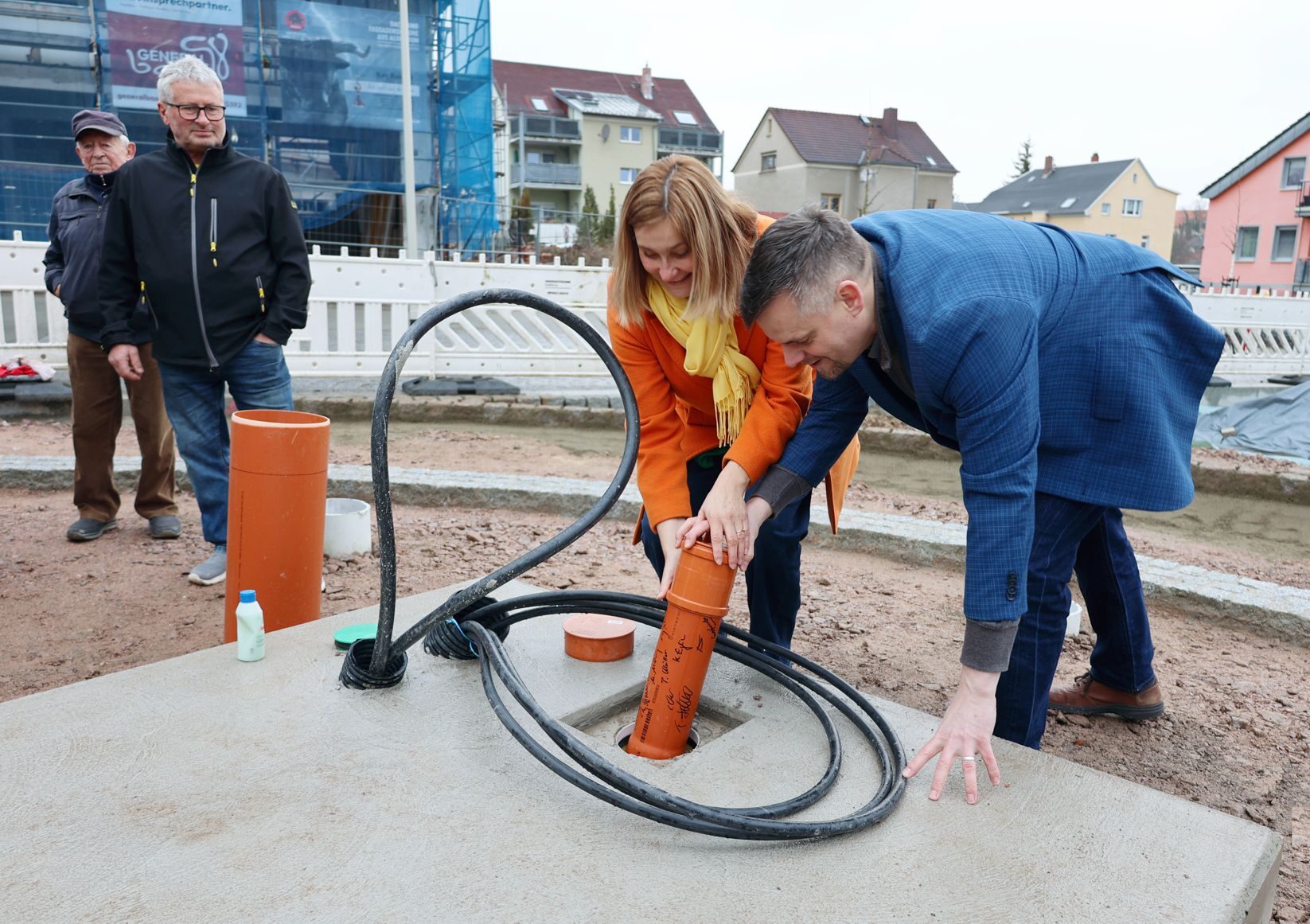 Ein besonderes Augenmerk gilt der traditionellen Pyramide, die voraussichtlich am 8. April 2026 an ihrem neuen Standort errichtet wird. Im Vorfeld wurde heute früh im Beisein der Oberbürgermeisterin durch den Planitzer Schnitzverein 1908 e.V. eine Zeitkapsel im Fundament der Pyramide versenkt. Dieser symbolische Akt markiert einen weiteren wichtigen Schritt hin zur Fertigstellung des Marktes.