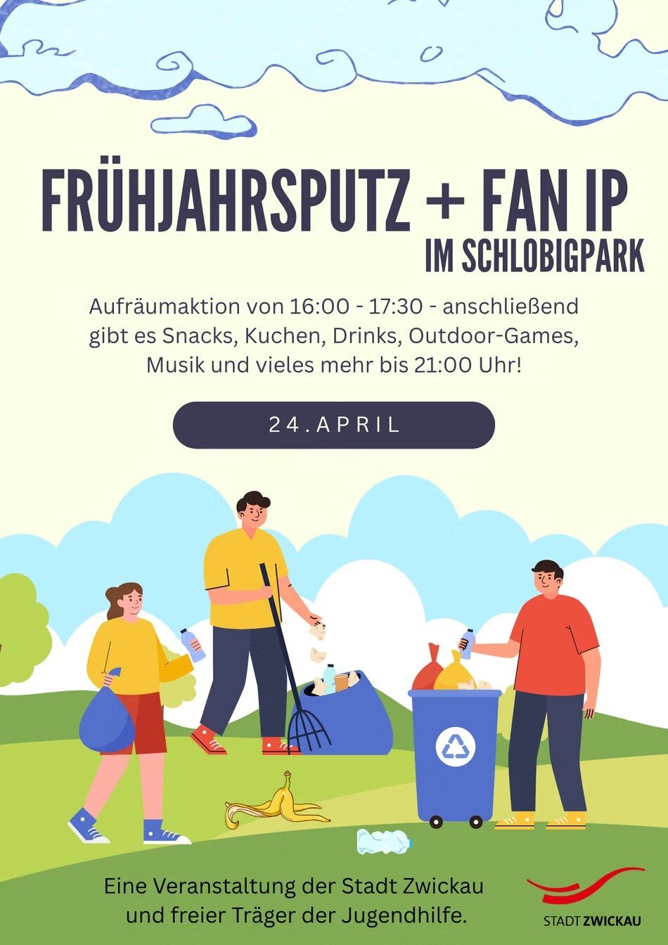 Am Freitag, 24. April 2026 findet von 16 bis 21 Uhr im Schlobigpark eine öffentliche Putzaktion mit anschließendem Freizeitspaß (FAN IP) statt. Im Rahmen der Aktion „Zwickau putzt sich raus“ laden das Streetwork der Diakonie Westsachsen, die Jugendfreizeiteinrichtungen und die Stabsstelle Kommunale Prävention Interessierte, Anwohner und Parkbesucher herzlich ein, gemeinsam mit Jugendlichen in ihrem Stadtteil aktiv zu werden. Grünflächen und umliegende Straßen sollen dabei von Unrat und Müll befreit werden.