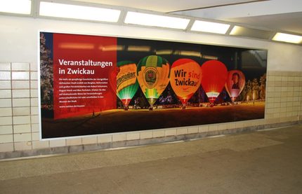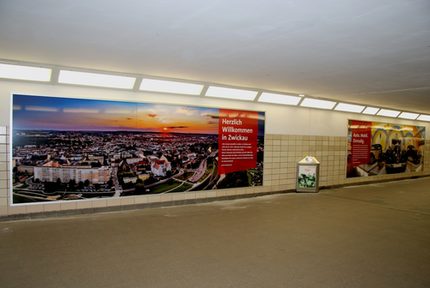 Seit vergangener Woche zieren drei großformatige Stadtpanoramen die Verbindungstunnel zwischen den Gleisen und der Haupthalle des Zwickauer Hauptbahnhofes. Die drei 6 mal 2 Meter großen Tafeln bringen nicht nur Farbe in die Gänge, sondern werben gleichzeitig für Museen und Veranstaltungen der Stadt. Das Projekt geht auf einen Vorschlag für den Bürgerhaushalt zurück.