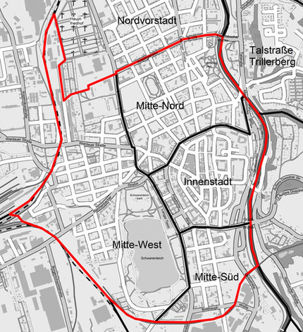 Der Geltungsbereich umfasst die Innenstadt und die innenstadtnahen, angrenzenden Vorstädte (Stadtteile Innenstadt, Mitte-Süd, Mitte-Nord, Mitte-West siehe Lageplan).