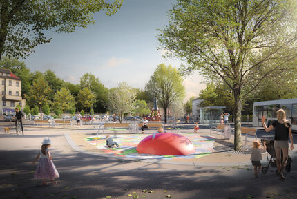 Schwerpunkt der Freiraumgestaltung ist, multifunktionale, für alle Generationen nutzbare und barrierefreie Platzflächen mit erheblichem Aufenthaltscharakter zu schaffen. So werden verschiedene Themeninseln mit unterschiedlichen Gestaltungsschwerpunkten angelegt: Spiel, Sitzen, Denkmal oder Pyramide. Verschiedene Pflanzungen (Bäume, Sträucher, Stauden) sind für ein angenehmes Stadtklima das A und O. Eine herausragende Rolle spielen vor allem Straßenbäume, da diese sowohl durch Staubfilterung, Verdunstung und Sauerstoffproduktion die Stadtluft verbessern, als auch durch Verschattung einer Aufheizung des Straßenraums entgegenwirken.