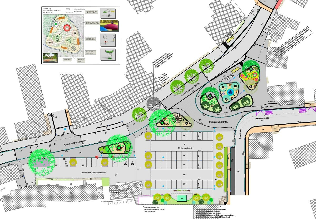 Der Planitzer Markt, welcher sich im Südwesten von Zwickau im Stadtteil Oberplanitz befindet, soll so umgestaltet werden, dass er als neues Stadtteilzentrum für Oberplanitz mit neu geordneter Anbindung an den ÖPNV fungiert. Die dabei neu strukturierten Verkehrs- und Nebenflächen haben auch das Ziel die historische Funktion als Markt- und Handelsplatz wieder zu beleben und werden in dem Areal Planitzer Markt als verkehrsberuhigter Bereich ausgewiesen. Solche verkehrsberuhigten Bereiche zeichnen sich durch das Mischungsprinzip aus und hat eine offene Gestaltung, d. h. es wird auf Hochborde, Markierungen und Beschilderung verzichtet, die Differenzierung von Fahrbahn und Seitenraum wird reduziert und Sichtbeziehungen zwischen allen Verkehrsteilnehmern werden hergestellt. Der motorisierte Individualverkehr hat verstärkt Rücksicht auf schwächere Verkehrsteilnehmer zu nehmen, Fußgänger erhalten ein Aufenthaltsrecht und die Erlaubnis, überall zu gehen und zu queren. Parken ist dabei auf den gekennzeichneten Flächen zulässig. Somit wird künftig der Streckenabschnitt der Äußeren Zwickauer Straße von Hausnummer 23 bis zur Nummer 54, inklusive dem neu zu errichtenden Mehrzweckplatz, den Themeninseln sowie der Platzüberfahrt ausschließlich für den ÖPNV, welche die Äußere Zwickauer Straße mit der Edison-/Poststraße verbindet, ein verkehrsberuhigter Bereich.