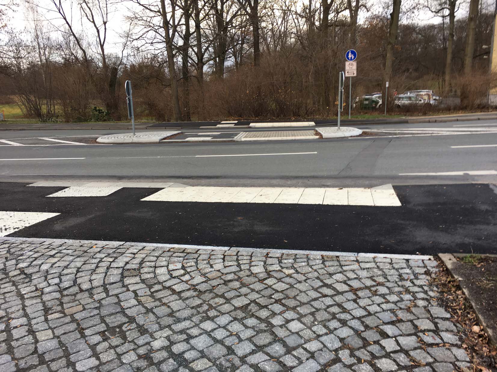 - Getrennte Führung von Sehbehinderten und Rollstuhlfahrern über diese Querungshilfe mittels unterschiedlicher Bordabsenkungen und geeigneter Bodenindikatoren (taktile Leitbeläge)
