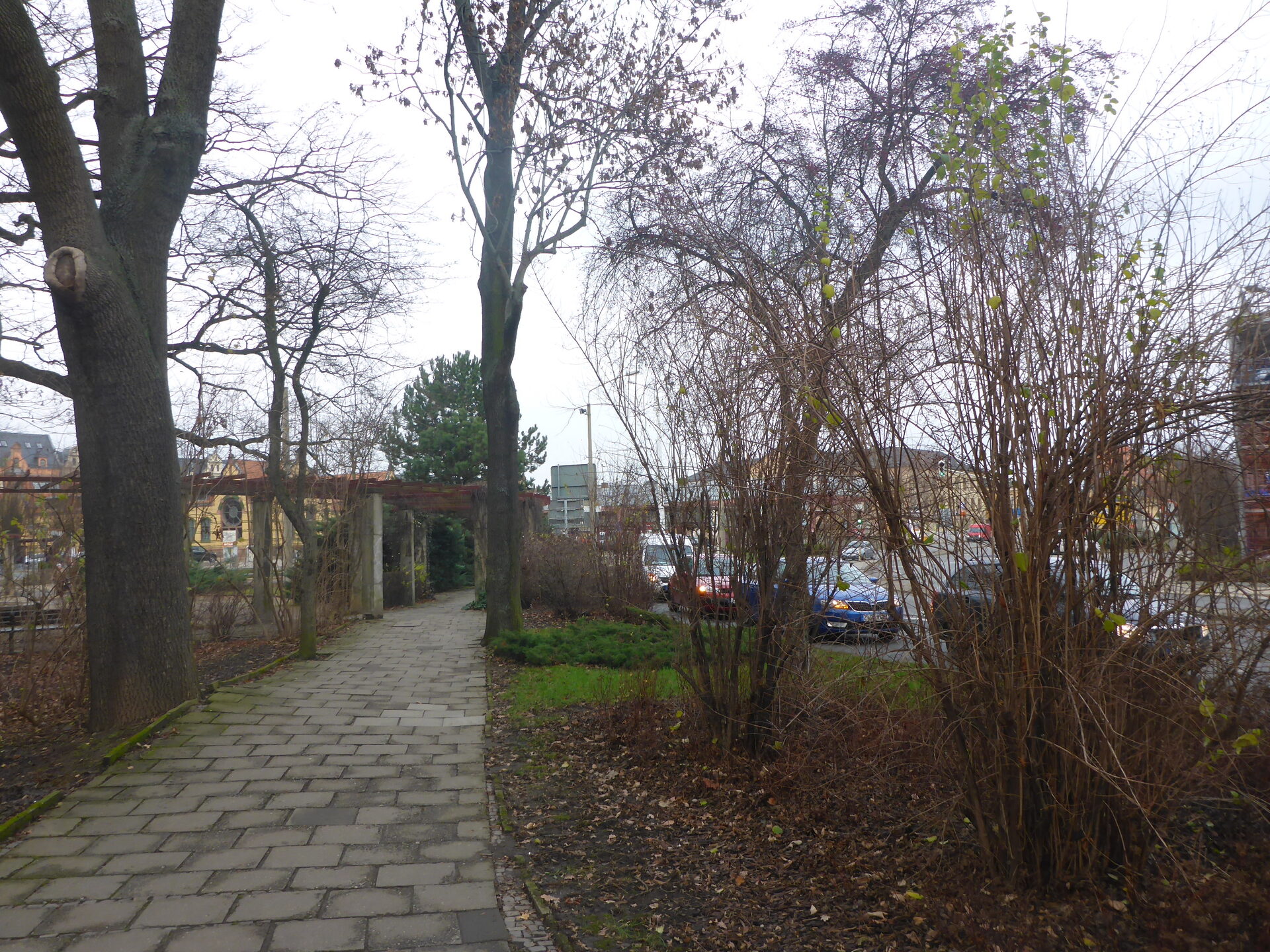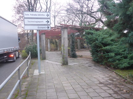 Auf Grund der Nähe der Humboldtstraße (5-streifiger Fahrbahnausbau im Staubereich der Kreuzung) führt die Strecke dann auf einer Länge von ca. 12 Metern durch eine großzügig angelegte Pergola.