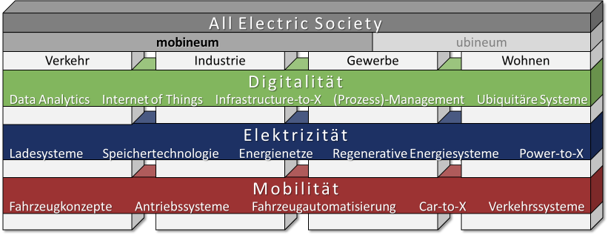Die sogenannte „All Electric Society“ vereint die Sektoren Verkehr, Industrie, Gewerbe und Wohnen und verortet darunter alle Vorgänge, die sich elektrifizieren lassen und damit die Nutzung von fossilen Energieträgern überflüssig machen. Für die All Electric Society müssen dabei die Fragestellungen der Mobilität, Elektrizität und Digitalität integriert betrachtet werden, wodurch ein neuer interdisziplinärer Forschungsbereich entsteht.