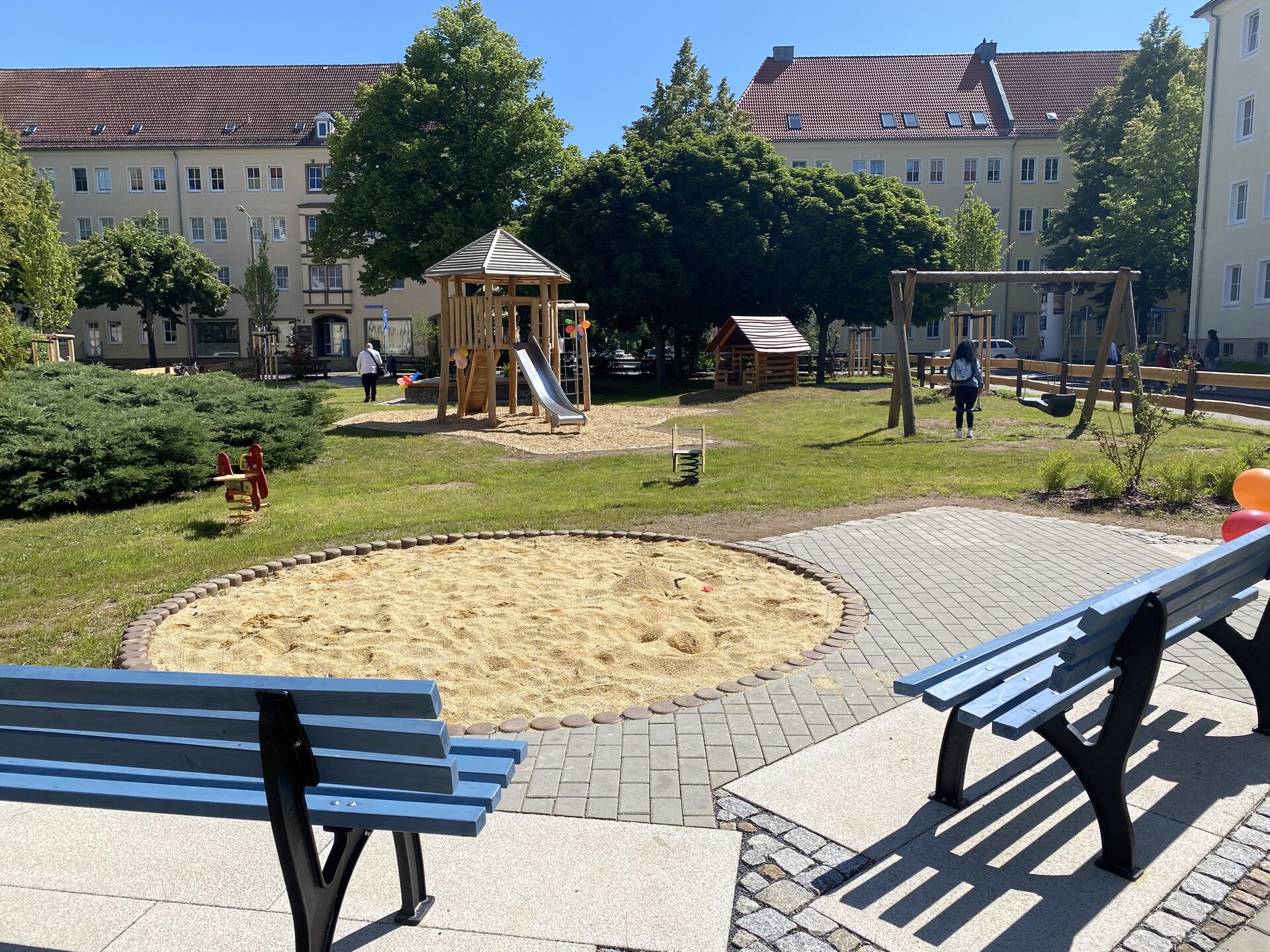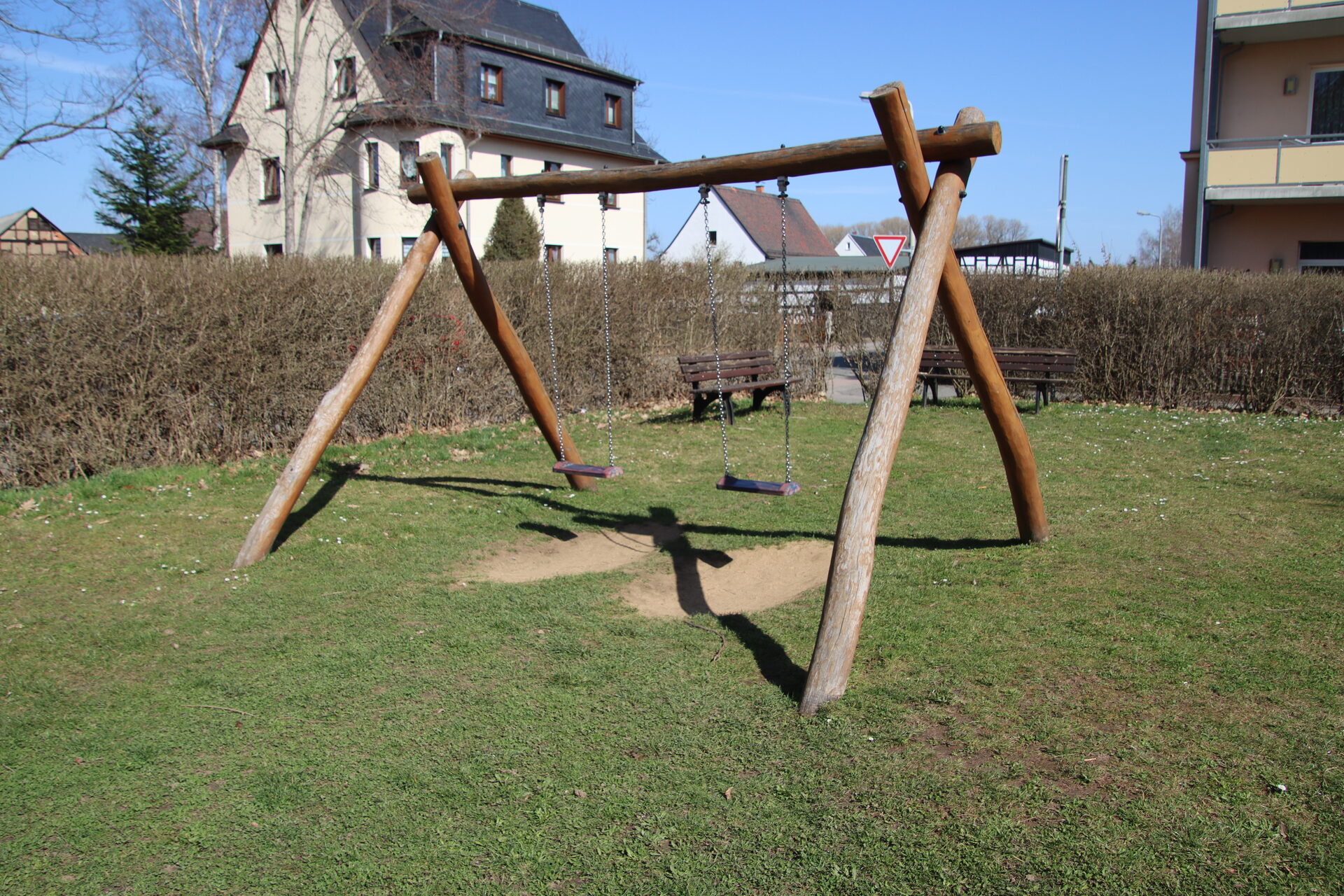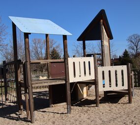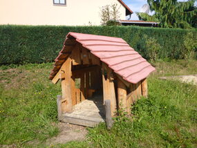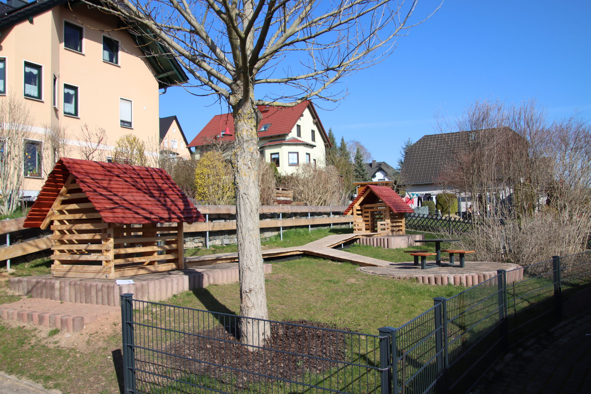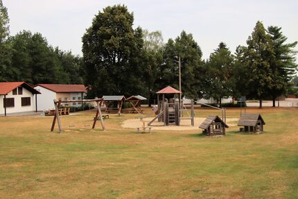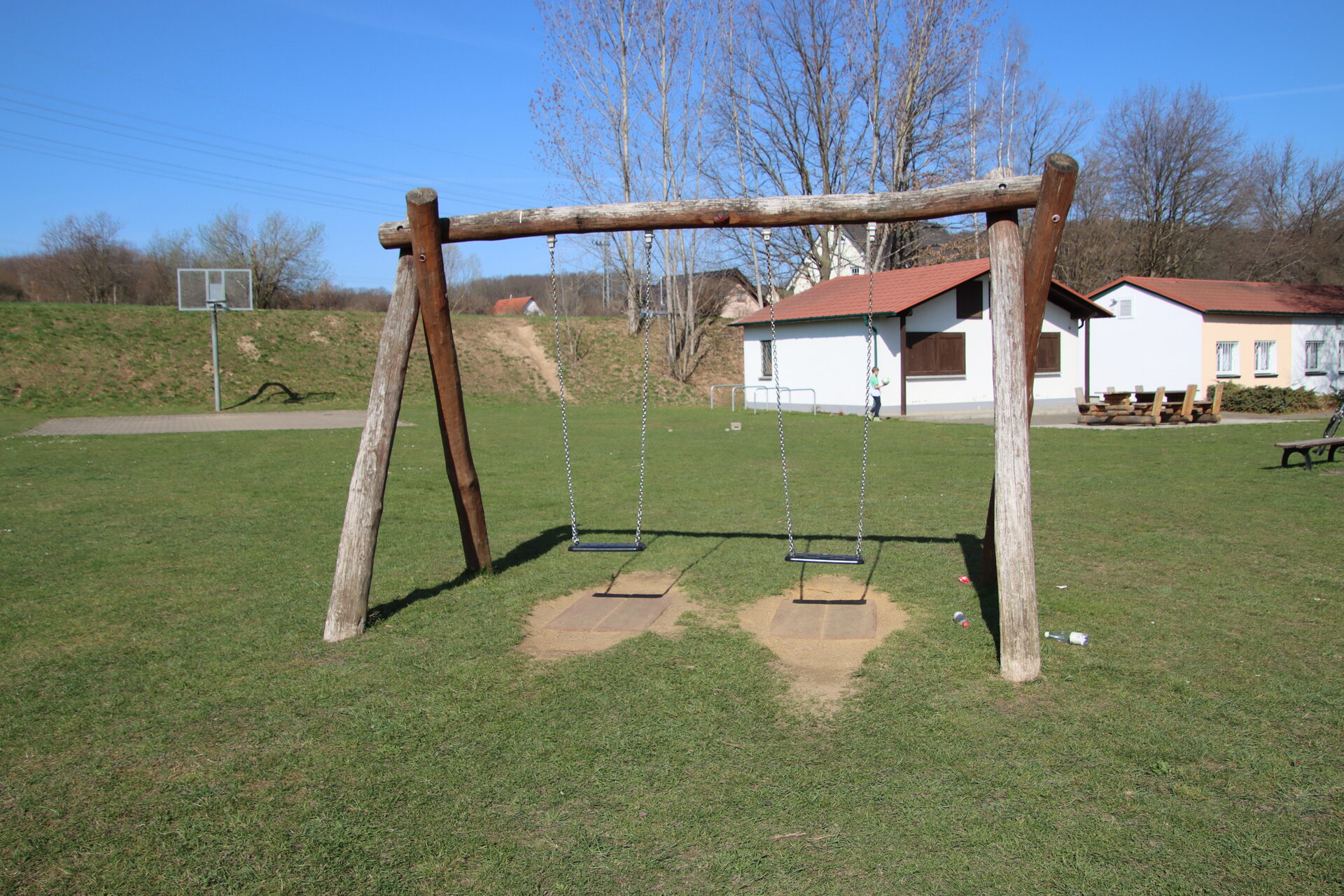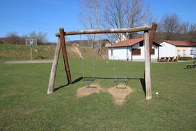 Spielanlage bestehend aus Doppelschaukel | Spielhäuser | Sitzbänke | 2 Kleinfeldtore
