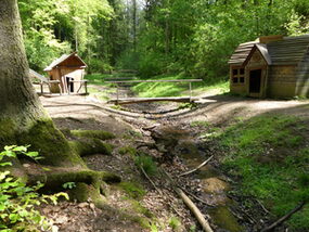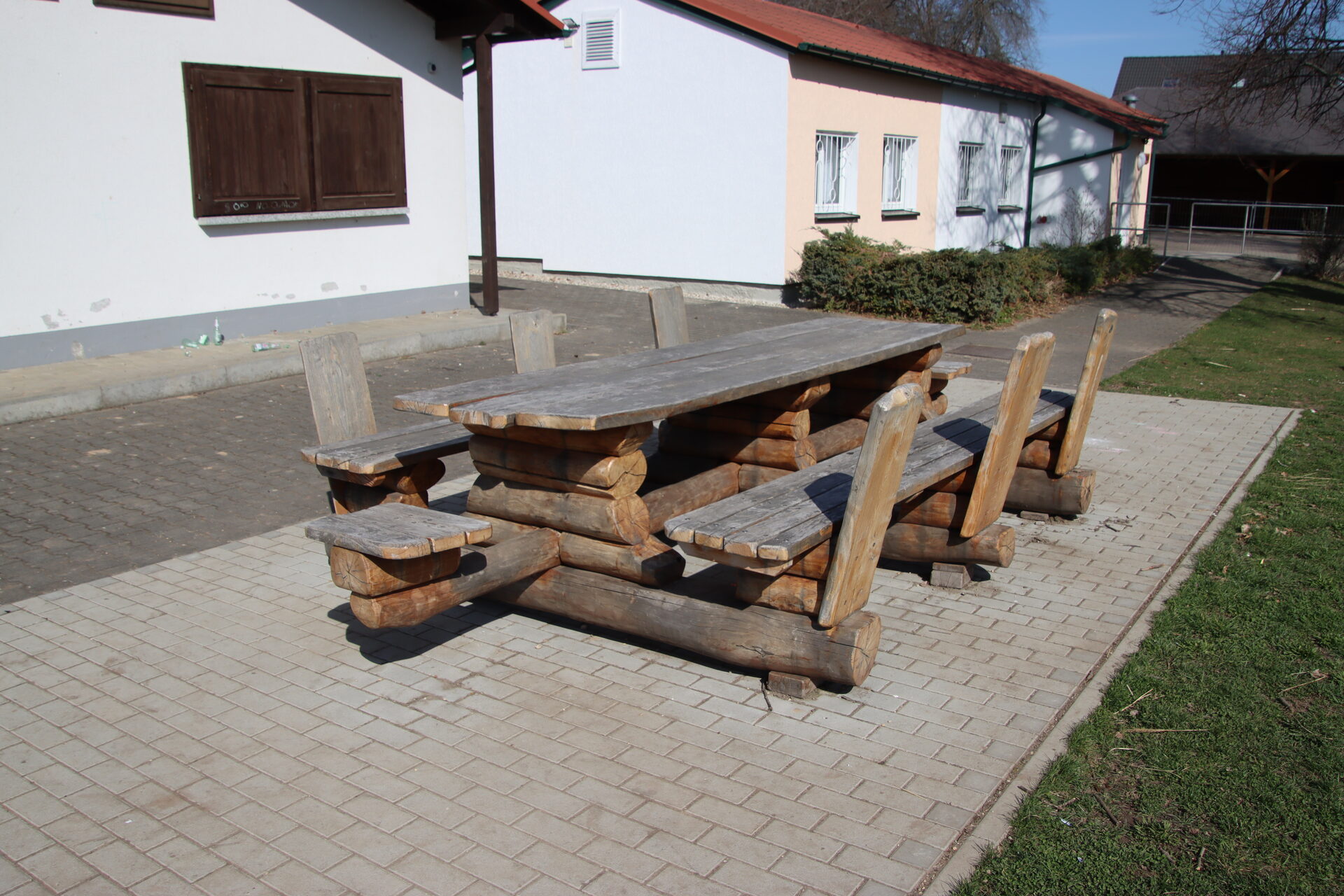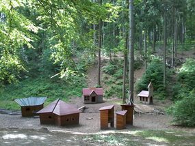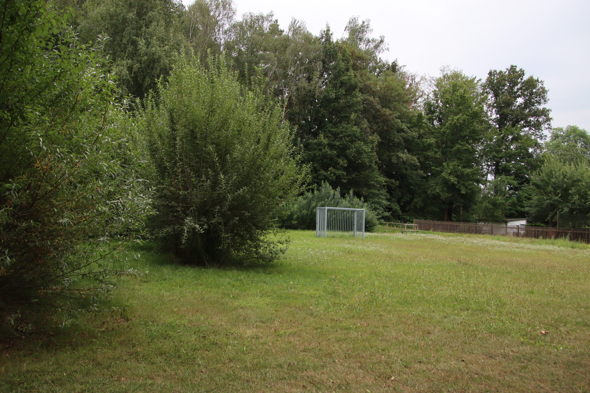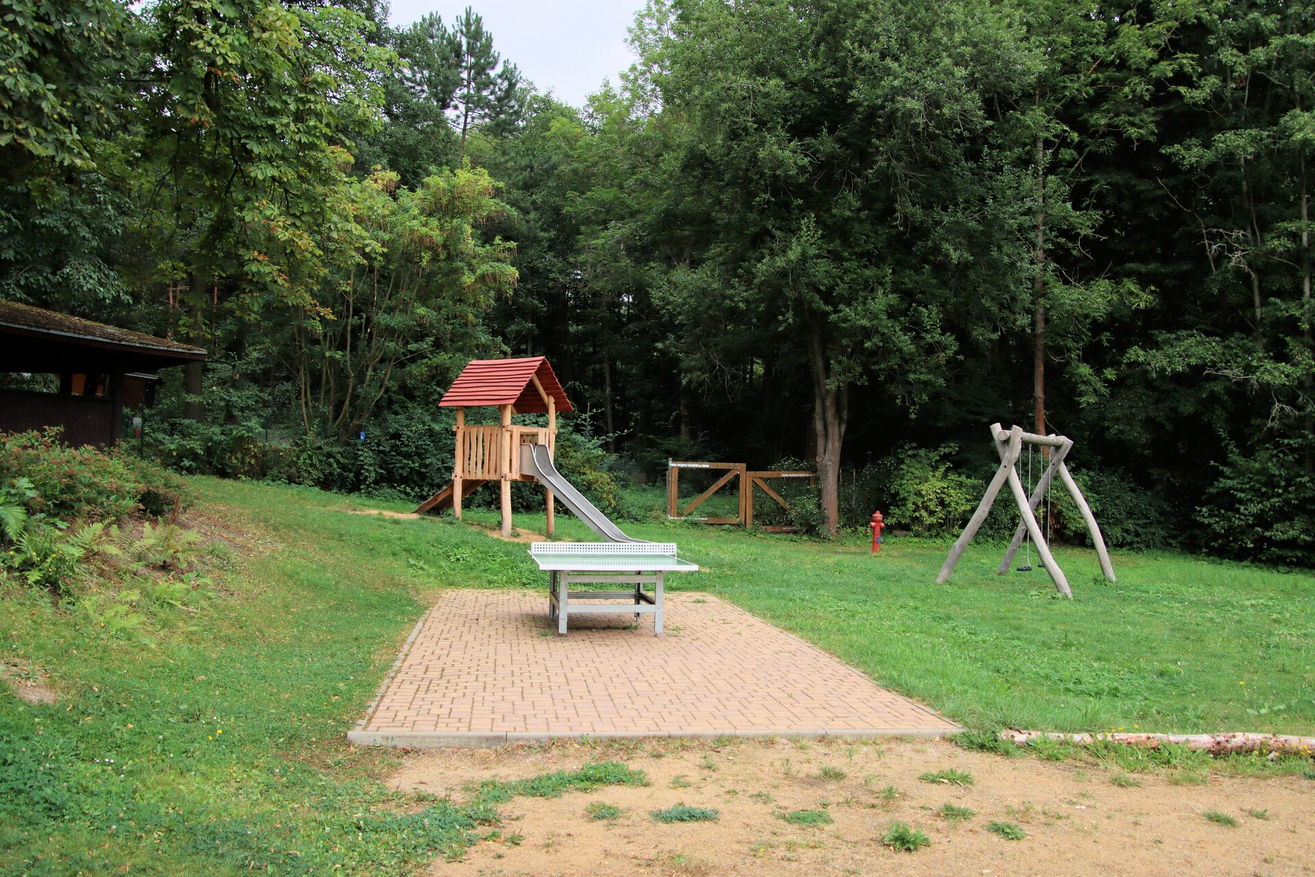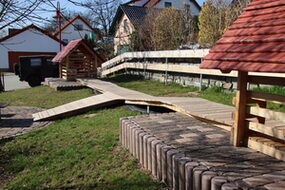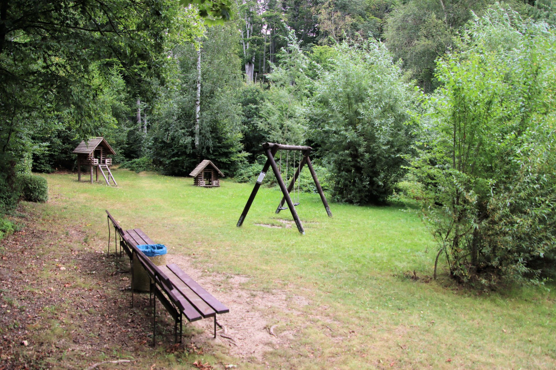 Spielanlage bestehend aus Doppelschaukel | Spielhäuser | Sitzbänke | 2 Kleinfeldtore