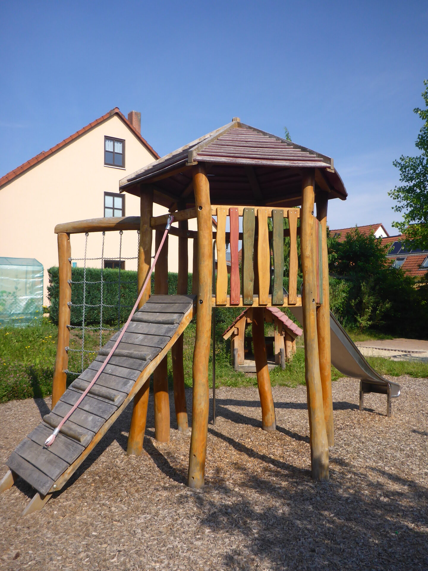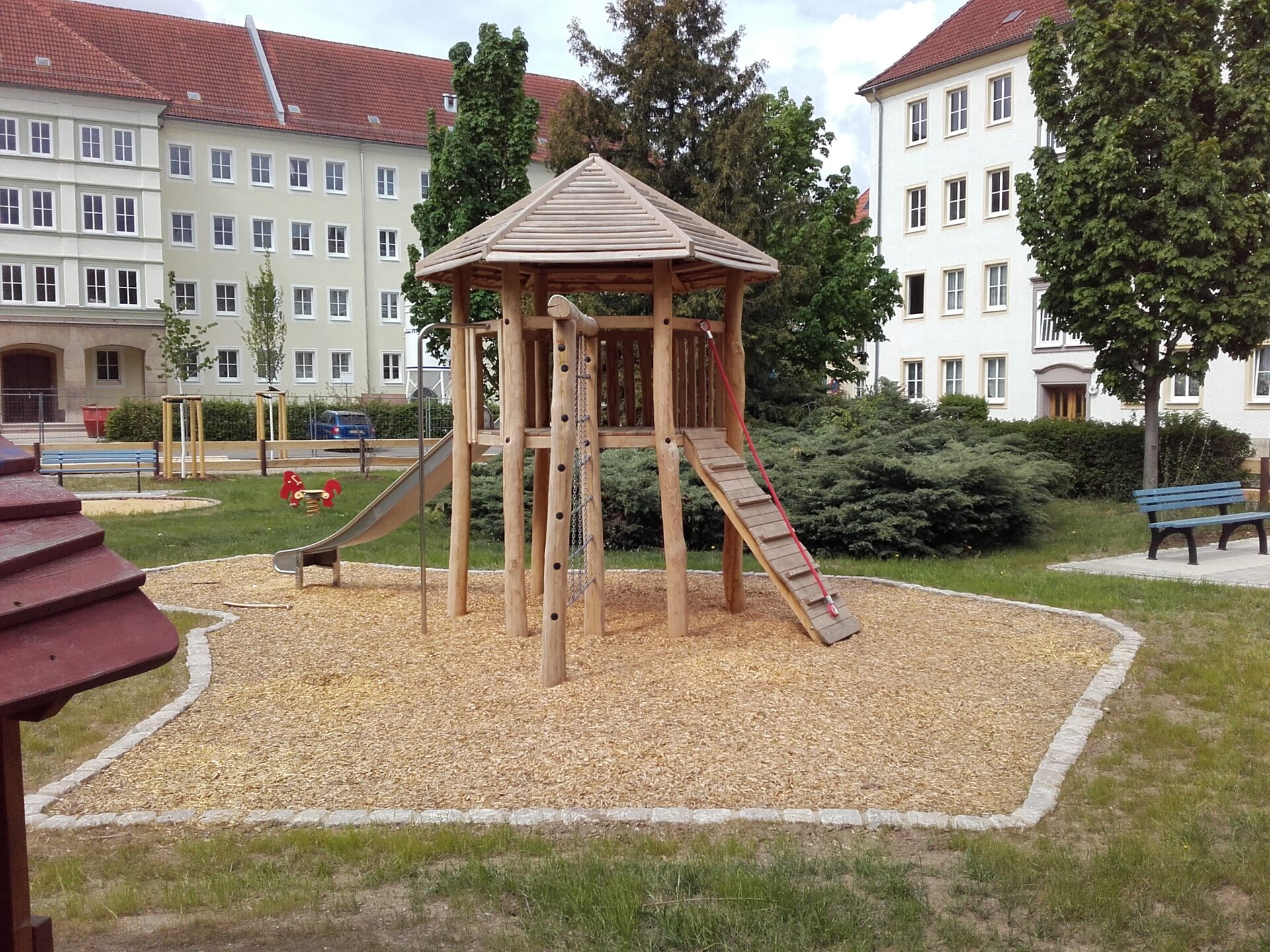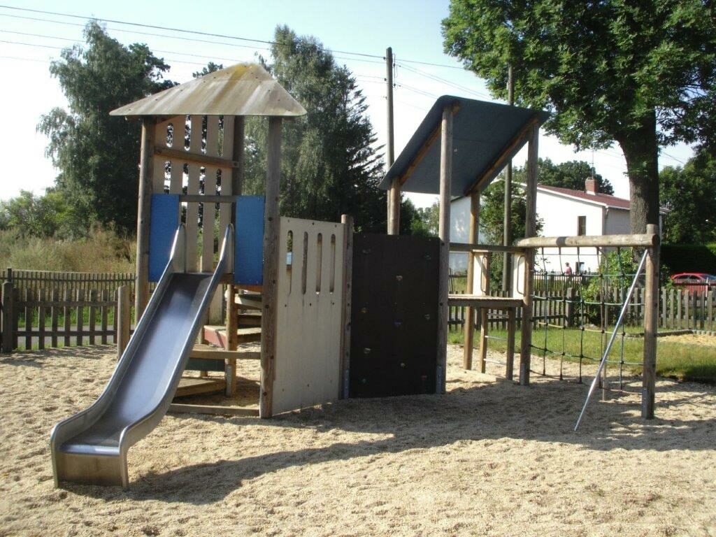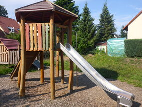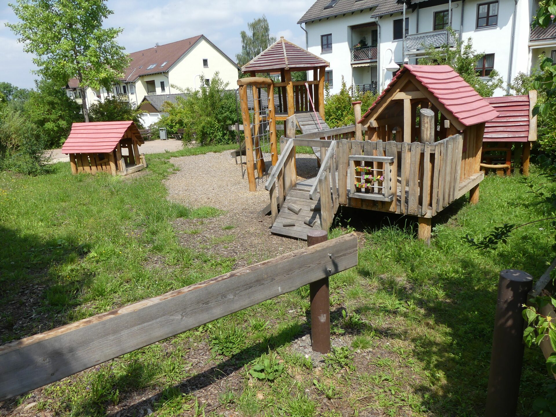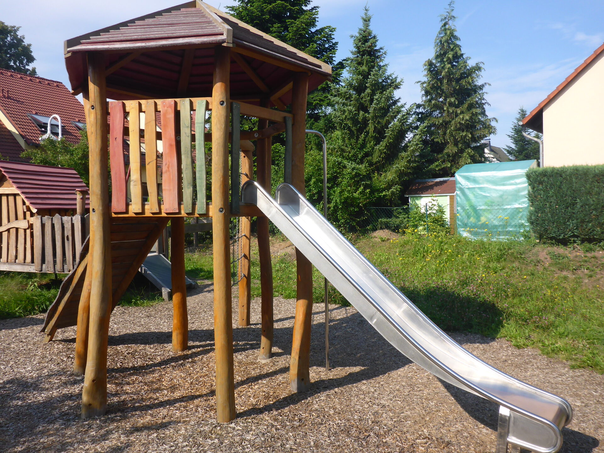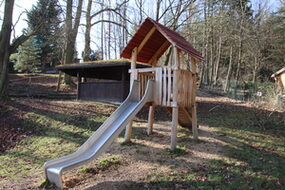 Sandkasten | Spielbude | Spielturm mit Rutsche, Kletternetz und Kletterrampe mit Halteseil | 2 Spielhütten | Bänke