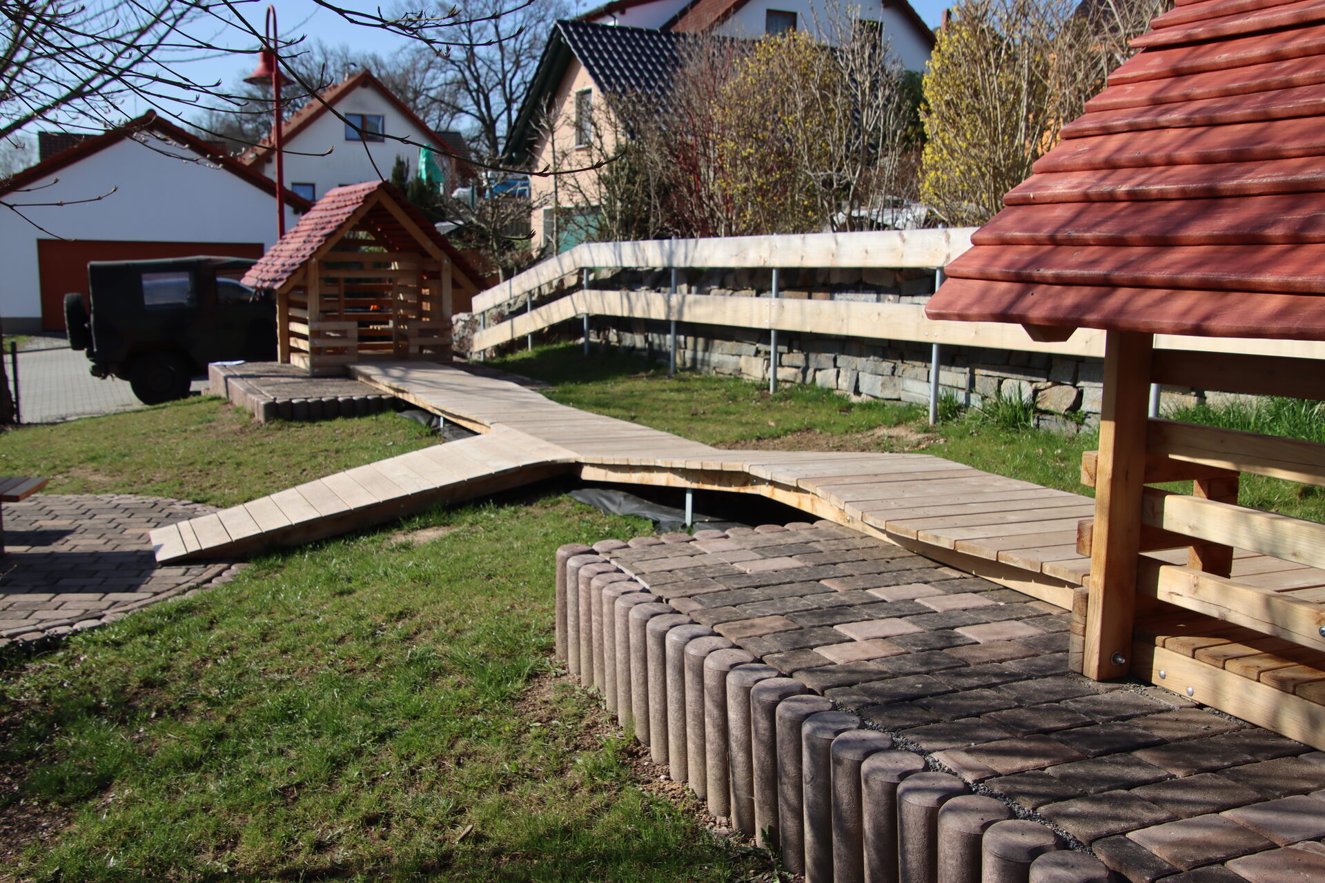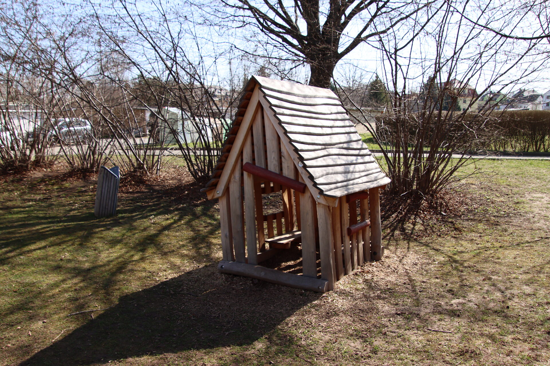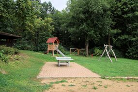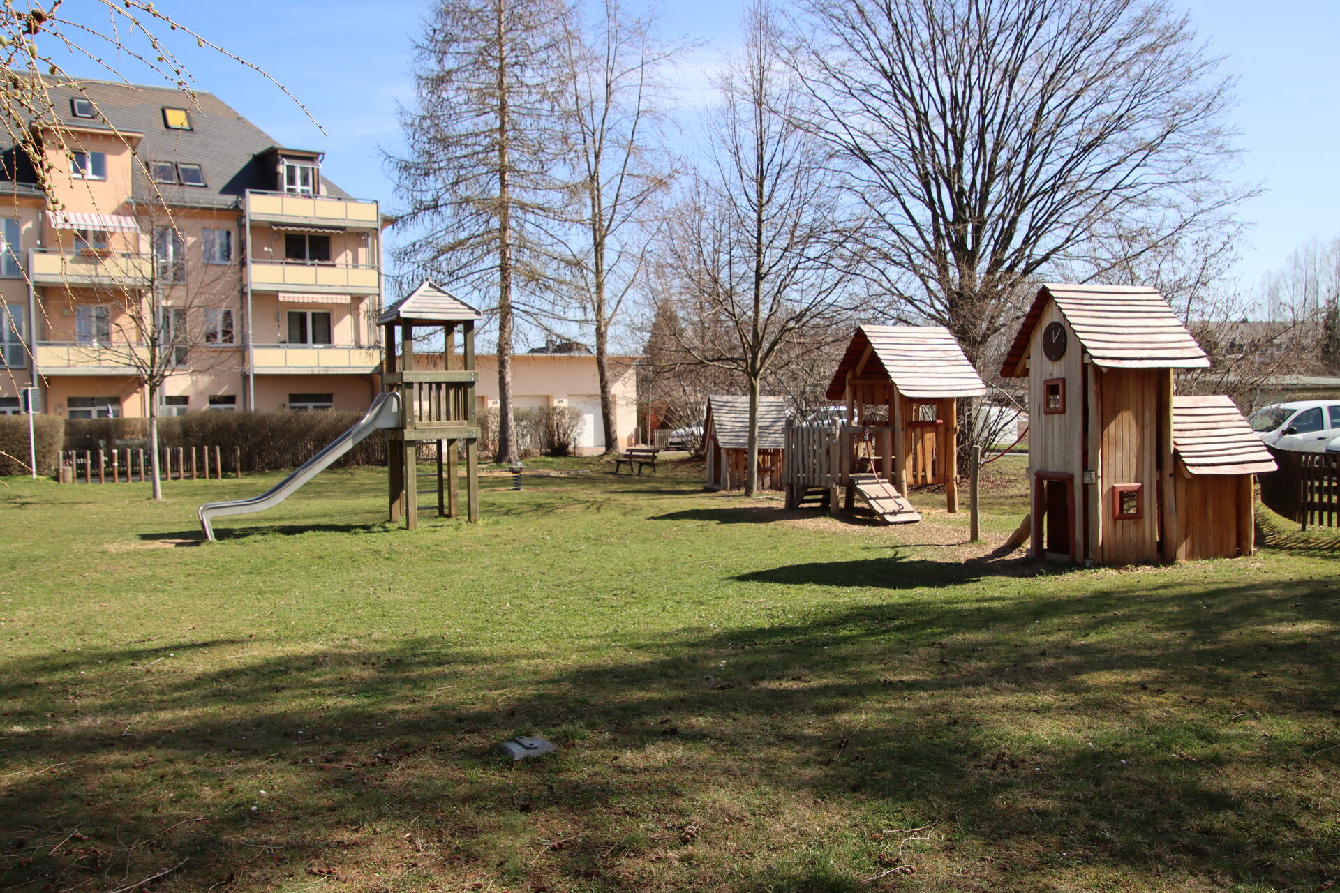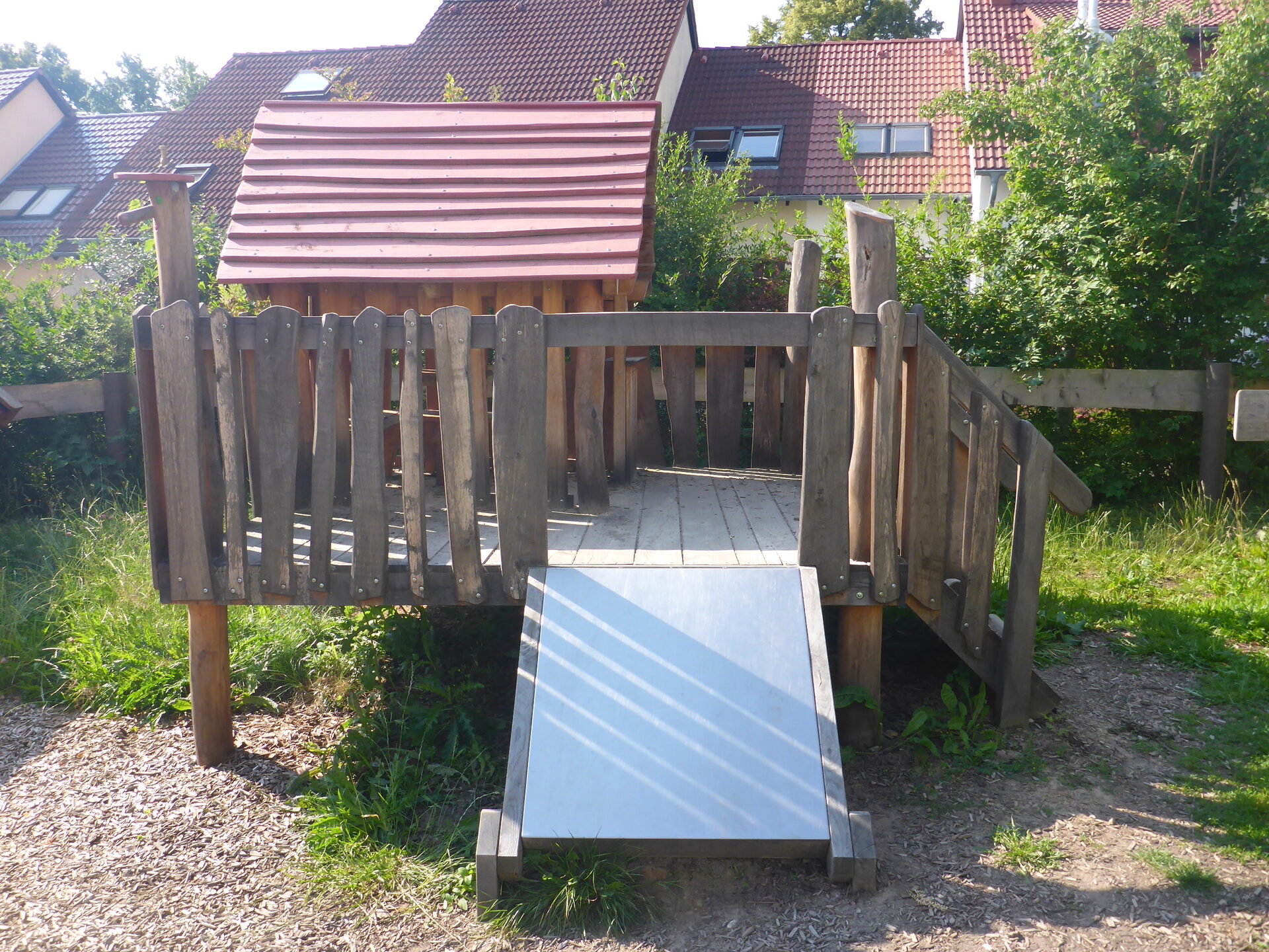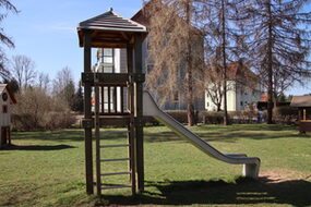 Sandkasten | Spielbude | Spielturm mit Rutsche, Kletternetz und Kletterrampe mit Halteseil | 2 Spielhütten | Bänke