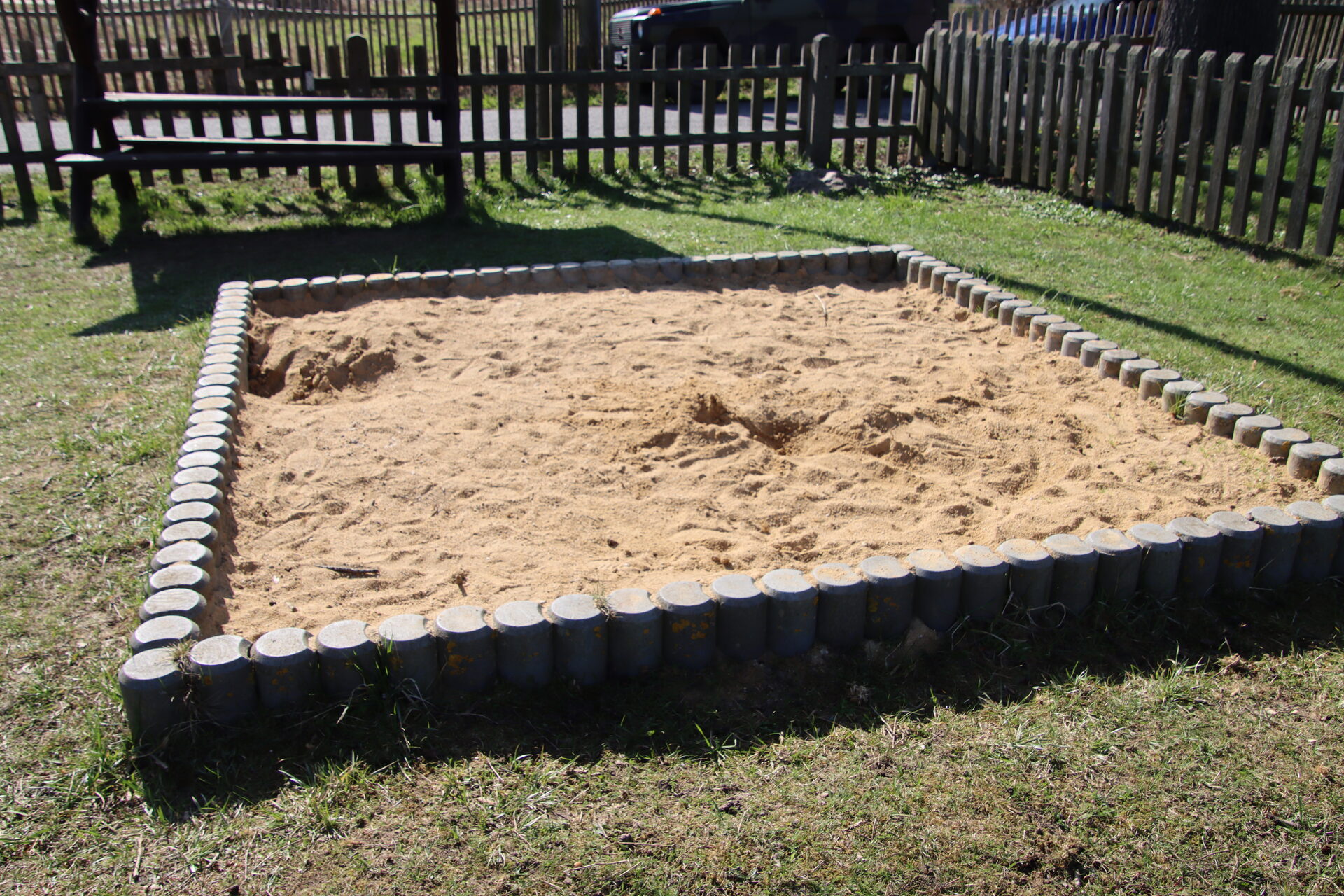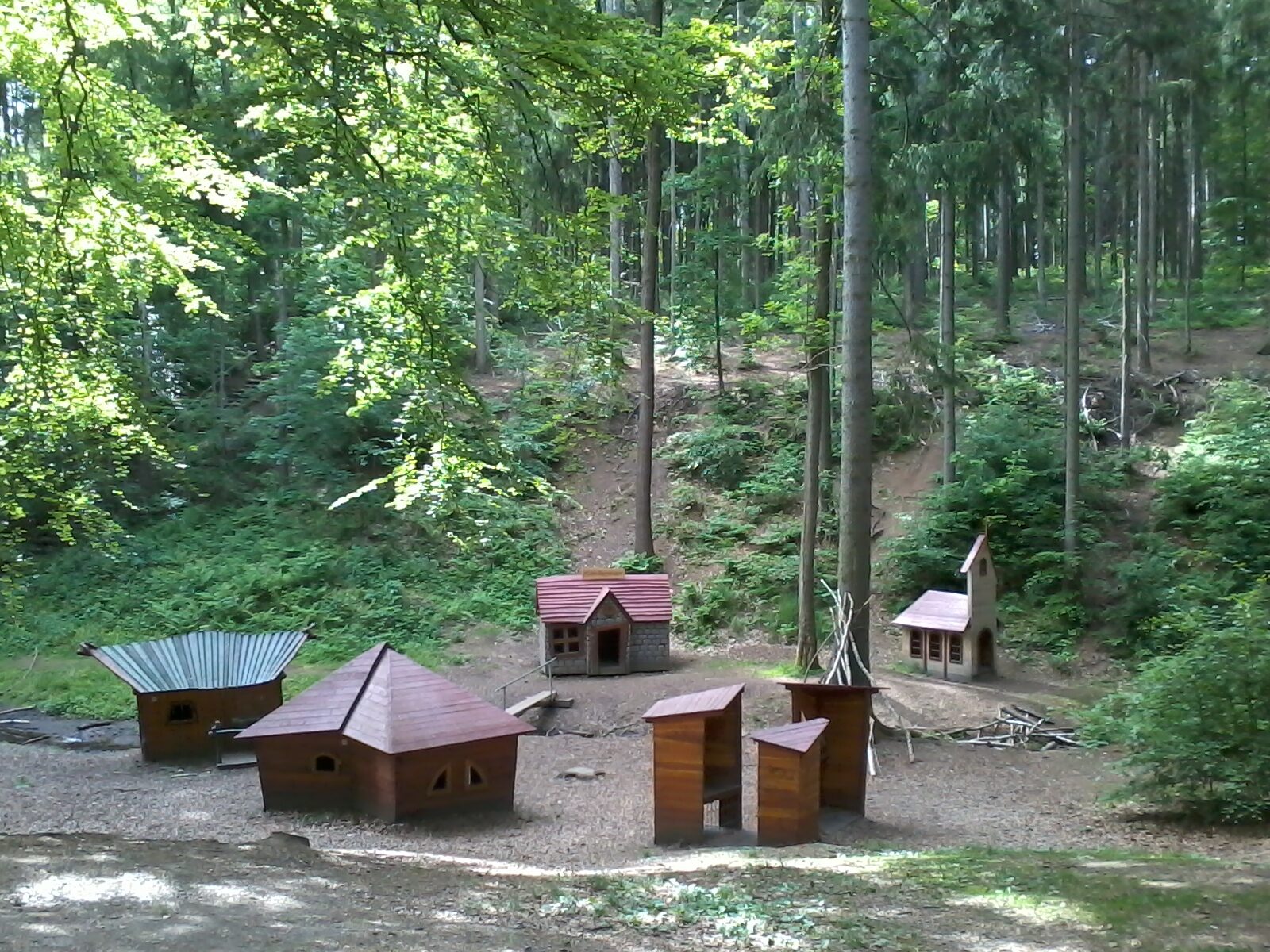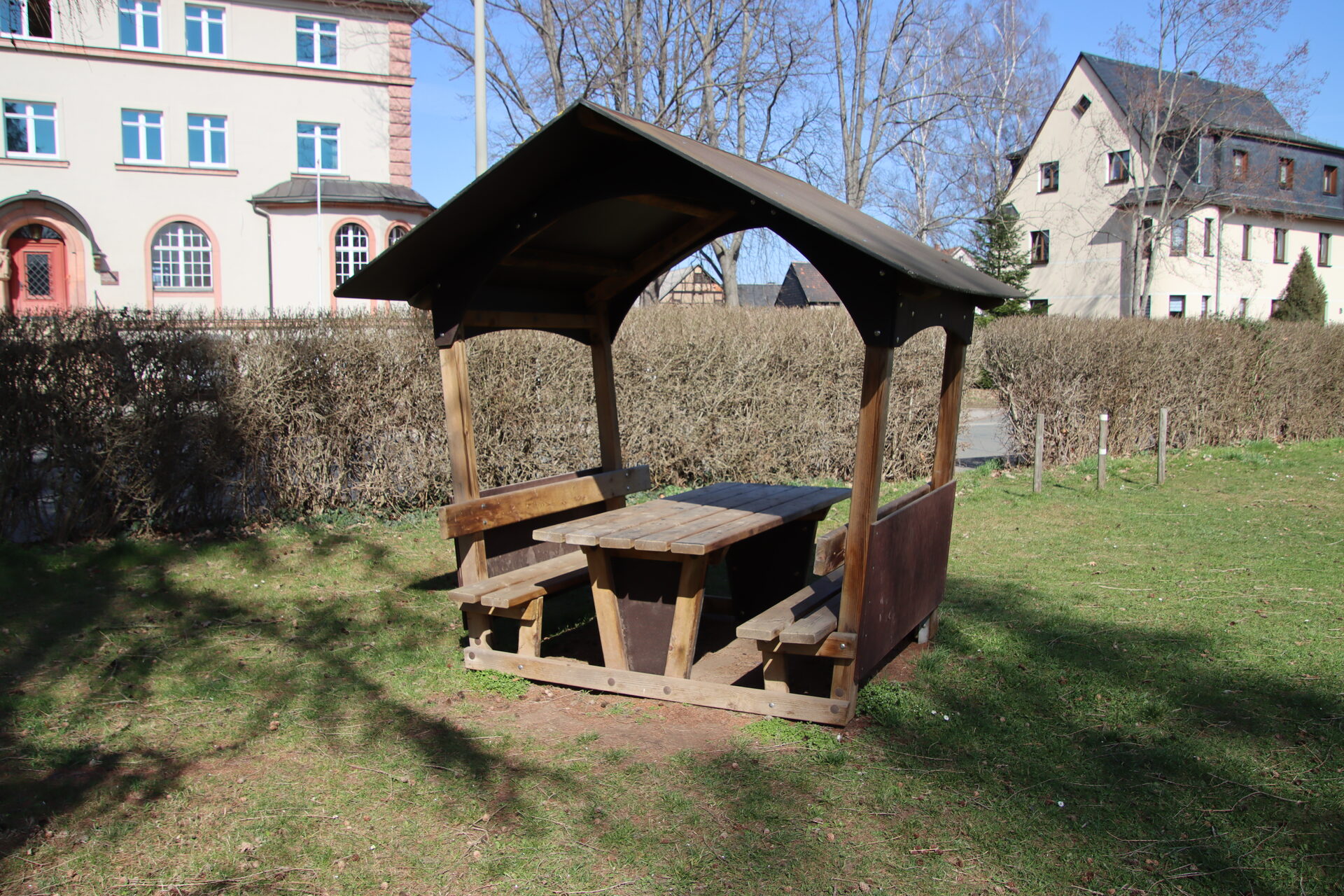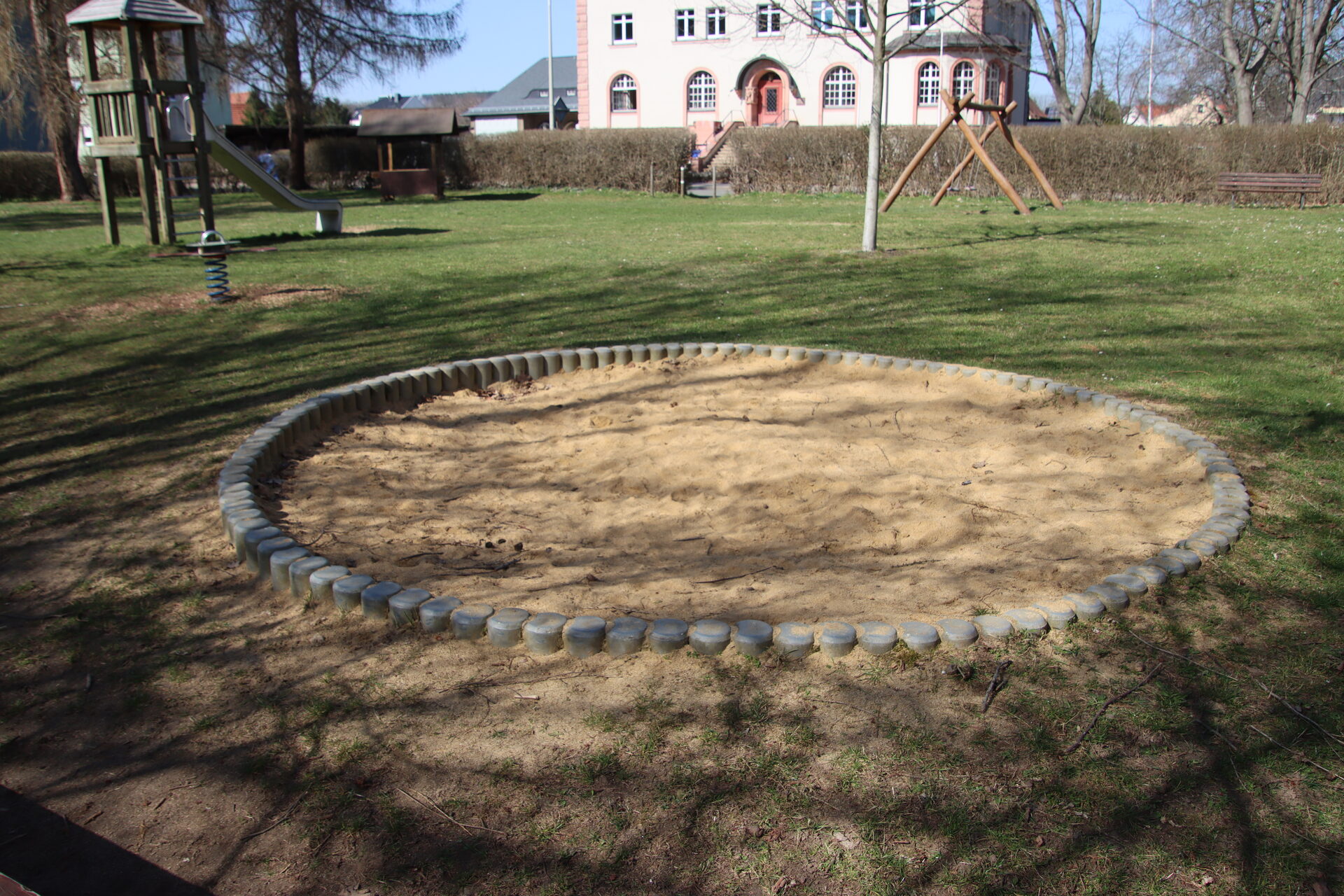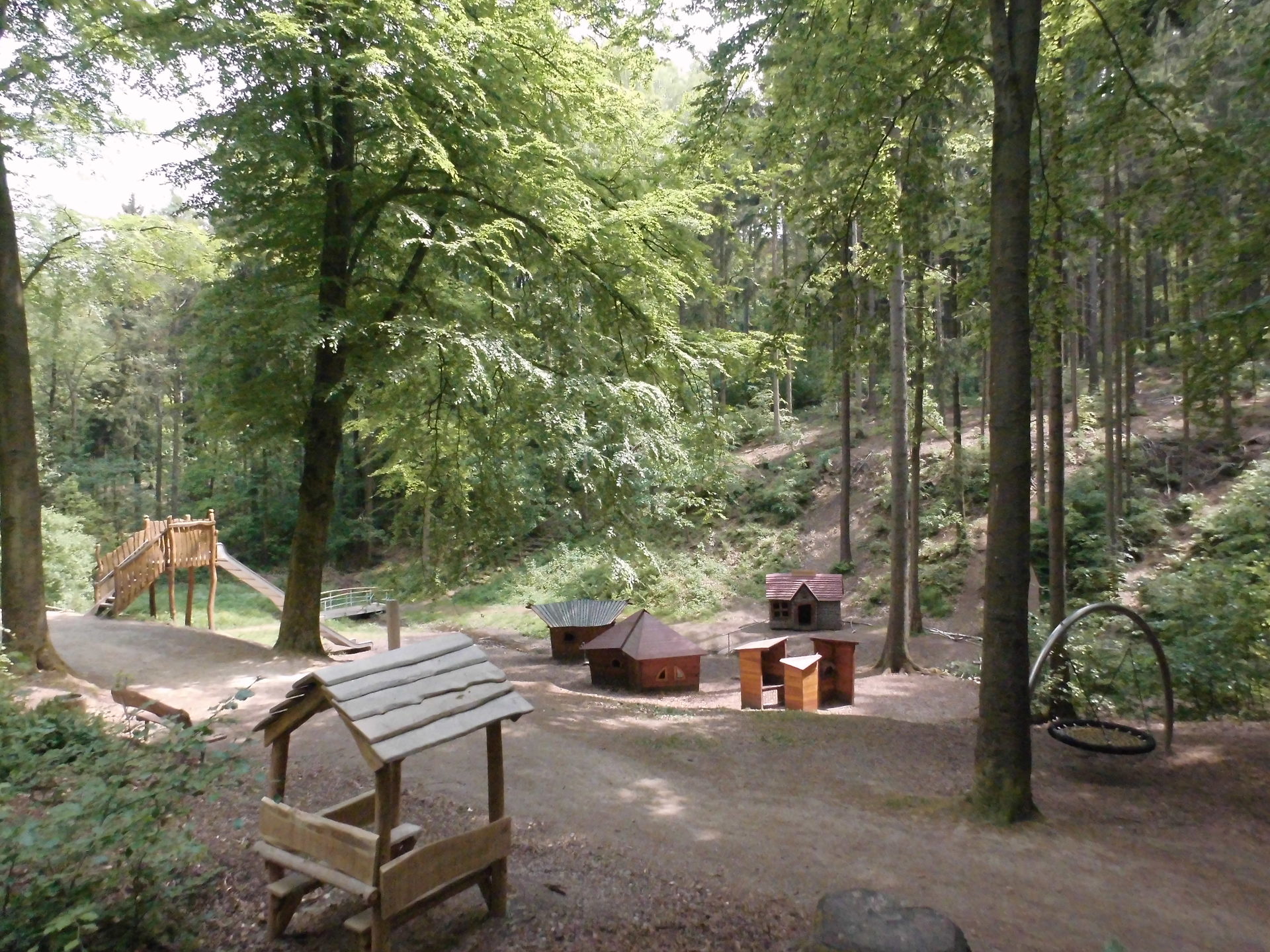 Sandkasten | Spielbude | Spielturm mit Rutsche, Kletternetz und Kletterrampe mit Halteseil | 2 Spielhütten | Bänke