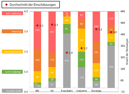 Im Rahmen der Bürgerbefragung wurde u. a. nach der subjektiven Belästigung durch die verschiedenen Lärmquellen im Stadtgebiet gefragt. Die vorgegebenen Antwortmöglichkeiten reichten von „nicht belästigt“ bis „sehr belästigt“. Darüber hinaus bestand die Möglichkeit, mit „kommt nicht vor“ zu antworten.